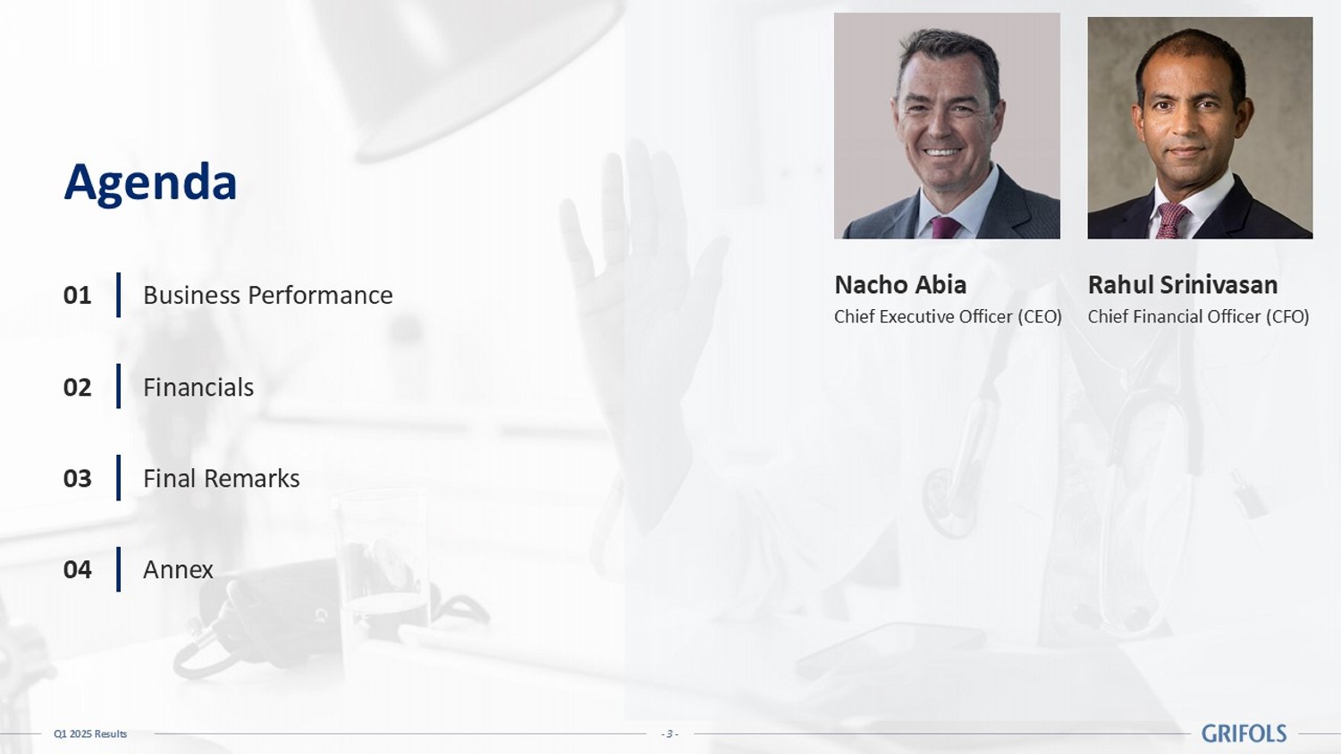 - 2 - Q1 2025 Results Legal Disclaimer Important Information This presentation does not constitute an offer or invitation to purchase or subscribe shares, in accordance with the provisio ns of the Regulation (EU) 2017/1129 of the European Parliament and of the Council of 14 June 2017 on the prospectus to be published when securities are offered to the public or admitted to trading on a regulated m ark et, and repealing Directive 2003/71/EC, the Spanish Securities Market and Investment Services Law (Law 6/2023, of 17 March, as amended and restated from time to time) and its implementing regulations . I n addition, this document does not constitute an offer of purchase, sale or exchange, nor a request for an offer of purchase, sale or exchange of securities, nor a request for any vote or approval in a ny other jurisdiction. This information has not been audited. Forward - Looking Statements This presentation contains forward - looking information and statements about Grifols based on current assumptions and forecast ma de by Grifols management, including pro forma figures, estimates and their underlying assumptions, statements regarding plans, objectives and expectations with respect to capital expenditures, synergi es, products and services, and statements regarding future performance. Forward - looking statements are statements that are not historical facts and are generally identified by the words “expected”, “potent ial ”, “estimates” and similar expressions. Although Grifols believes that the expectations reflected in such forward - looking statements are reasonable, various known and u nknown risks, uncertainties and other factors could lead to material differences between the actual future results, financial situation, development or performance of the Company and the estimates given her e. These factors include those discussed in our public reports filed with the Comisión Nacional del Mercado de Valores and the Securities and Exchange Commission, which are accessible to the public. The Company a ssu mes no liability whatsoever to update these forward - looking statements or conform them to future events or developments. Forward - looking statements are not guarantees of future performance. They have no t been reviewed by the auditors of Grifols. Alternative Performance Measures (APMs) This document and any related conference call or webcast (including a Q&A session) contain, in addition to the financial info rma tion prepared in accordance with IFRS, alternative performance measures (‘APMs’) as defined in the guidelines issued by the European Securities and Markets Authority (‘ESMA’) on October 5, 2015. APMs are used by Grifols’ management to evaluate the group’s financial performance, cash flows or financial position in making operational and strategic decisions for the group and therefore are useful information for inves tor s and other stakeholders. Certain key APMs form part of executive directors, management and employees’ remuneration targets. APMs are prepared on a consistent basis for the periods presented in this document. They should be considered in addition to IFR S measurements, may differ to definitions given by regulatory bodies relevant to the group and to similarly titled measures presented by other companies. They have not been audited, reviewed or verified by the ext ernal auditor of Grifols. For further details on the definition, explanation on the use, and reconciliation of APMs, please see the appendix as well as the “Alternative performance measures” document from our websi te www.grifols.com/en/investors .
