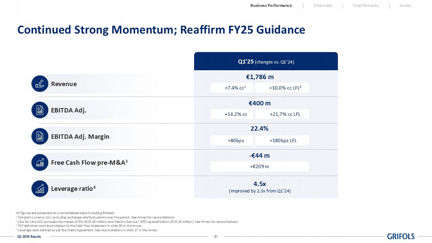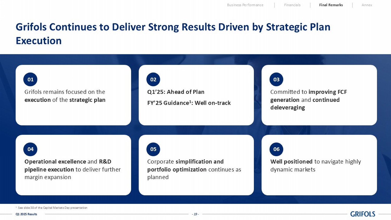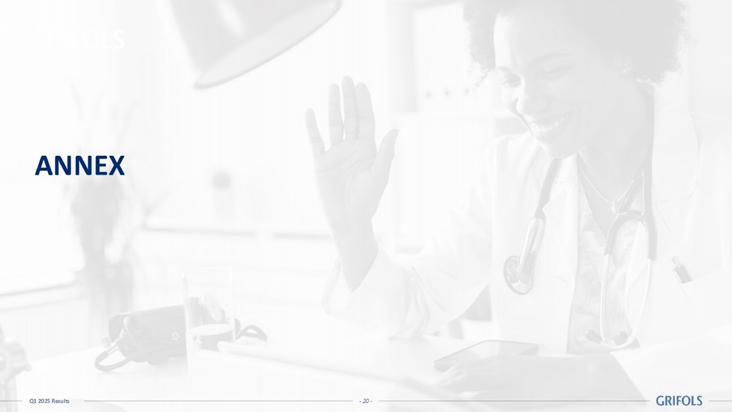 - 19 - Q1 2025 Results Grifols remains focused on the execution of the strategic plan Q1’25: Ahead of Plan FY’25 Guidance 1 : Well on - track Committed to improving FCF generation and continued deleveraging Operational excellence and R&D pipeline execution to deliver further margin expansion Corporate simplification and portfolio optimization continues as planned Well positioned to navigate highly dynamic markets 01 02 03 04 05 06 Grifols Continues to Deliver Strong Results Driven by Strategic Plan Execution Business Performance Financials Final Remarks Annex 1 See slide 38 of the Capital Markets Day presentation