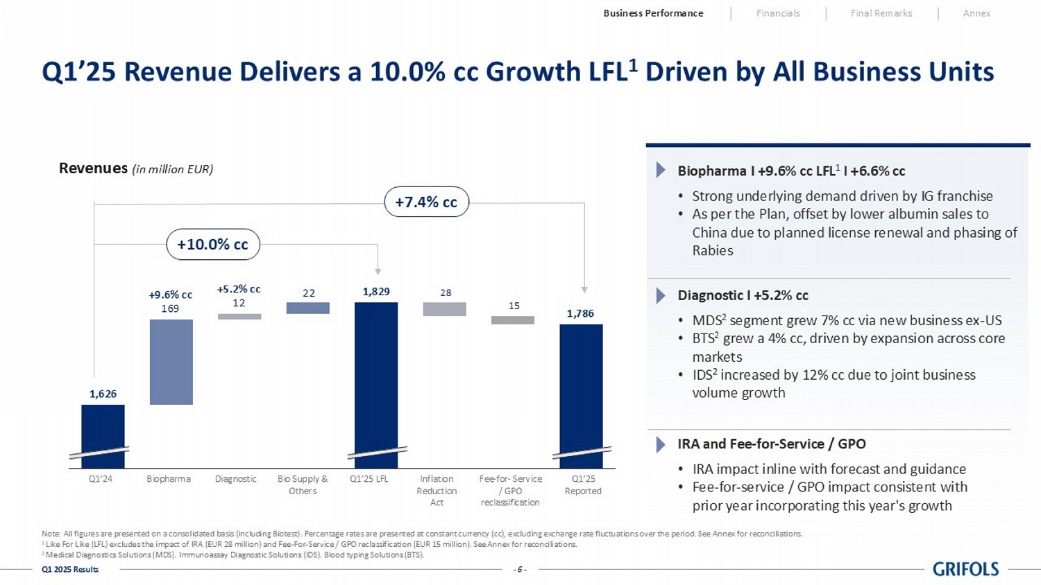 - 5 - Q1 2025 Results Continued Strong Momentum ; Reaffirm FY25 Guidance All figures are presented on a consolidated basis (including Biotest). 1 Constant currency (cc), excluding exchange rate fluctuations over the period. See Annex for reconciliations. 2 Like For Like (LFL) excludes the impact of IRA (EUR 28 million) and Fee - For - Service / GPO reclassification (EUR 15 million). Se e Annex for reconciliations 3 FCF definition and reconciliation to the Cash Flow Statement in slide 30 in the Annex. 4 Leverage ratio defined as per the Credit Agreement. See reconciliations in slide 27 in the Annex. Business Performance Financials Final Remarks Annex Q1’25 (changes vs. Q1’24) Revenue EBITDA Adj. EBITDA Adj. Margin Free Cash Flow pre - M&A 3 Leverage ratio 4 €1,786 m +7.4% cc 1 +10.0% cc LFL 2 4.5x (improved by 2.3x from Q1’24) €400 m +14.2% cc +21.7% cc LFL 22.4% +80 bps +180bps LFL - €44 m +€209 m