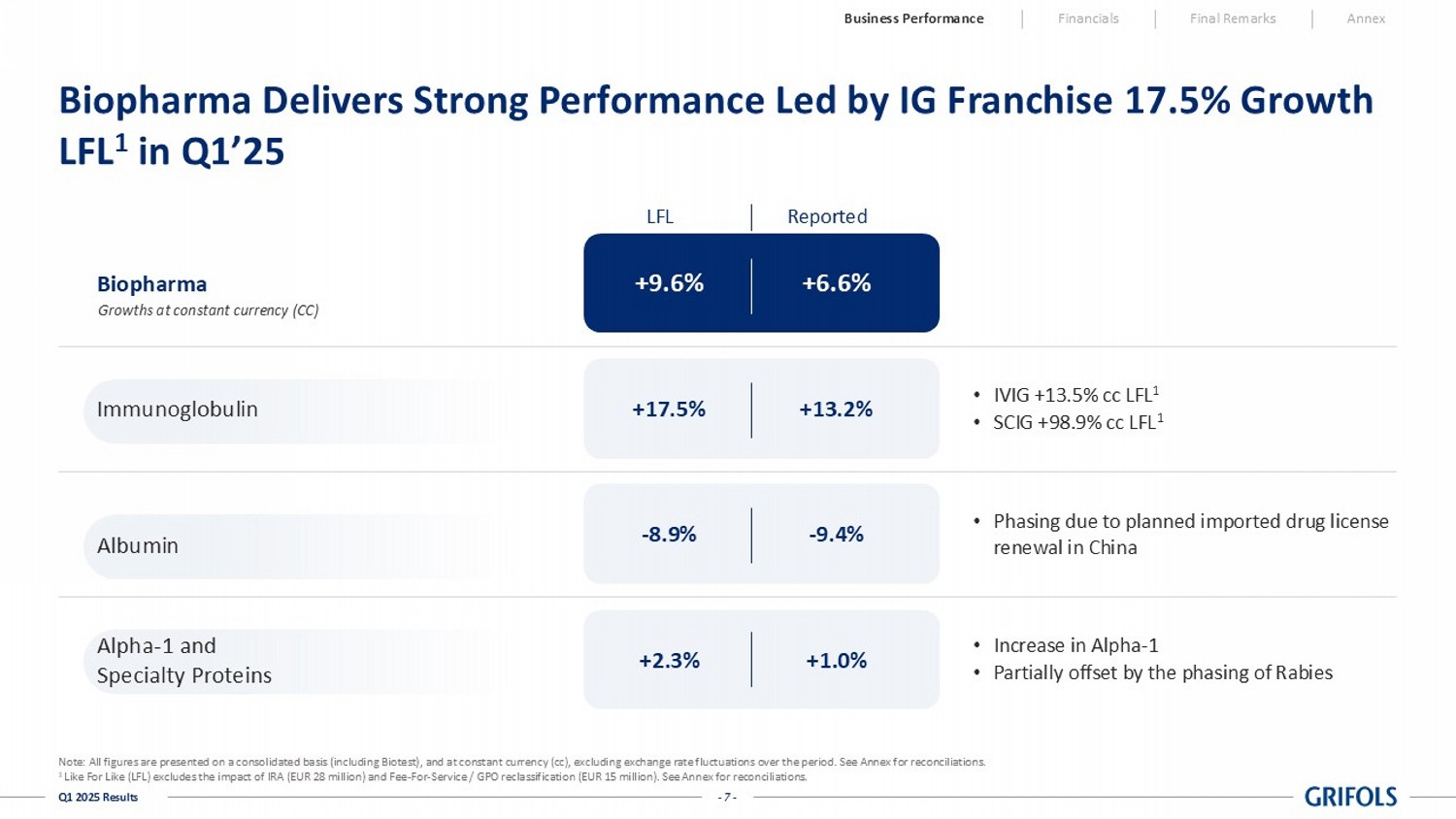 - 6 - Q1 2025 Results Q1’25 Revenue Delivers a 10.0% cc Growth LFL 1 Driven by All Business Units Note: All figures are presented on a consolidated basis (including Biotest). Percentage rates are presented at constant curre ncy (cc), excluding exchange rate fluctuations over the period. See Annex for reconciliations. 1 Like For Like (LFL) excludes the impact of IRA (EUR 28 million) and Fee - For - Service / GPO reclassification (EUR 15 million). See Annex for reconciliations. 2 Medical Diagnostics Solutions (MDS). Immunoassay Diagnostic Solutions (IDS). Blood typing Solutions (BTS). Revenues (in million EUR) 1,626 1,829 1 2 3 4 5 6 7 8 Q1’24 Biopharma Diagnostic Bio Supply & Others Q1’25 LFL Fee - for - S ervice / GPO reclassification Q1’25 Reported Inflation Reduction Act 1,786 +9.6% cc 169 +5.2% cc 12 22 15 28 +10.0% cc +7.4% cc Business Performance Financials Final Remarks Annex Biopharma I +9.6% cc LFL 1 I +6.6% cc • Strong underlying demand driven by IG franchise • As per the Plan, offset by lower albumin sales to China due to planned license renewal and phasing of Rabies Diagnostic I +5.2% cc • MDS 2 segment grew 7% cc via new business ex - US • BTS 2 grew a 4% cc, driven by expansion across core markets • IDS 2 increased by 12% cc due to joint business volume growth IRA and Fee - for - Service / GPO • IRA impact inline with forecast and guidance • Fee - for - service / GPO impact consistent with prior year incorporating this year's growth