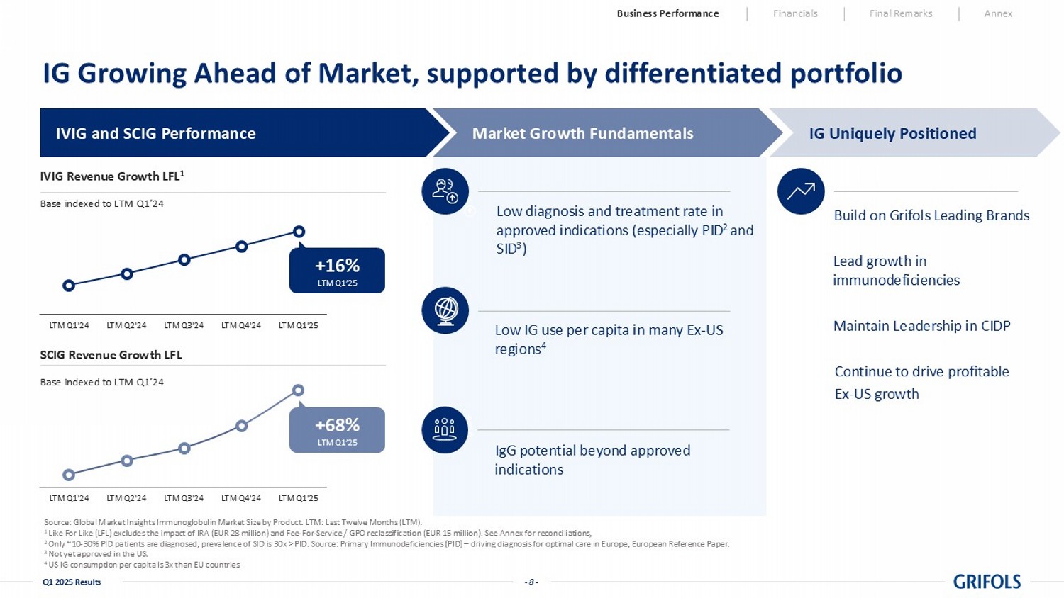 - 8 - Q1 2025 Results IG Growing Ahead of Market , supported by differentiated portfolio Source: Global Market Insights Immunoglobulin Market Size by Product. LTM: Last Twelve Months (LTM). 1 Like For Like (LFL) excludes the impact of IRA (EUR 28 million) and Fee - For - Service / GPO reclassification (EUR 15 million). See Annex for reconciliations, 2 Only ~10 - 30% PID patients are diagnosed, preval ence of SID is 30x > PID. Source: Primary Immunodeficiencies (PID) – driving diagnosis for optimal care in Europe, European Refe rence Paper. 3 Not yet approved in the US. 4 US IG consumption per capita is 3x than EU countries Business Performance Financials Final Remarks Annex IVIG Revenue Growth LFL 1 Base indexed to LTM Q1’24 LTM Q1'24 LTM Q2'24 LTM Q3'24 LTM Q4'24 LTM Q1'25 SCIG Revenue Growth LFL Base indexed to LTM Q1’24 LTM Q1'24 LTM Q2'24 LTM Q3'24 LTM Q4'24 LTM Q1'25 +16% LTM Q1’25 +68% LTM Q1’25 Low diagnosis and treatment rate in approved indications (especially PID 2 and SID 3 ) Low IG use per capita in many Ex - US regions 4 IgG potential beyond approved indications IVIG and SCIG Performance Market Growth Fundamentals Build on Grifols Leading Brands Lead growth in immunodeficiencies IG Uniquely Positioned Maintain Leadership in CIDP Continue to drive profitable Ex - US growth