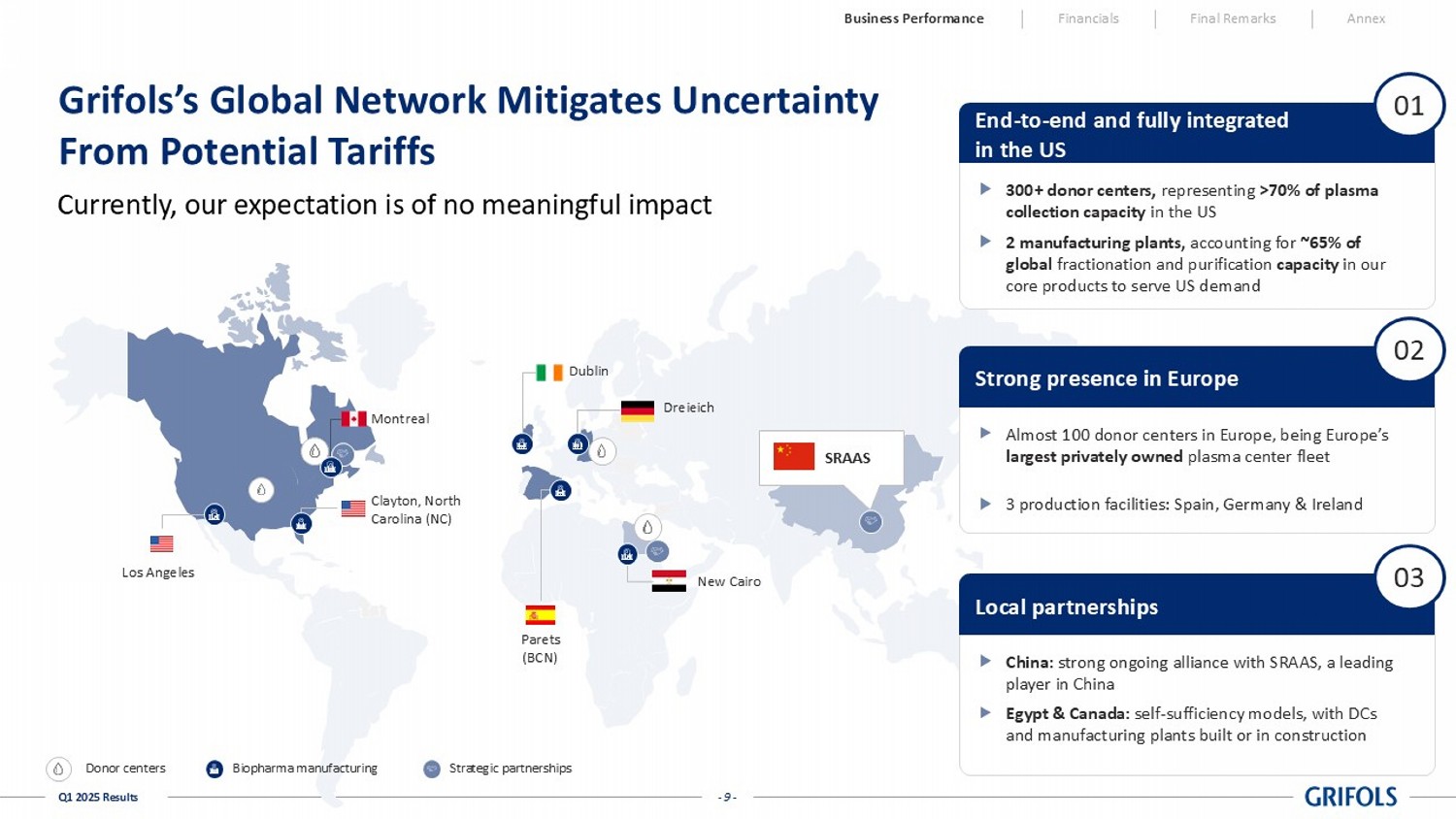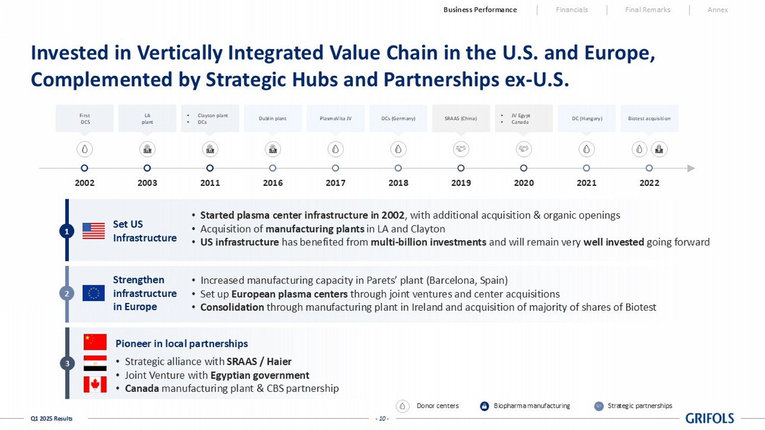 - 9 - Q1 2025 Results Grifols’s Global Network Mitigates Uncertainty From Potential Tariffs Los Angeles Clayton, North Carolina (NC) Montreal New Cairo Parets (BCN) Dublin SRAAS Dreieich Donor centers Biopharma manufacturing Strategic partnerships End - to - end and fully integrated in the US 300+ donor centers, representing >70% of plasma collection capacity in the US 2 manufacturing plants, accounting for ~65% of global fractionation and purification capacity in our core products to serve US demand 01 Strong presence in Europe Almost 100 donor centers in Europe, being Europe’s largest privately owned plasma center fleet 3 production facilities: Spain, Germany & Ireland 02 Local partnerships China: strong ongoing alliance with SRAAS, a leading player in China Egypt & Canada: self - sufficiency models, with DCs and manufacturing plants built or in construction 03 Currently, our expectation is of no meaningful impact Business Performance Financials Final Remarks Annex