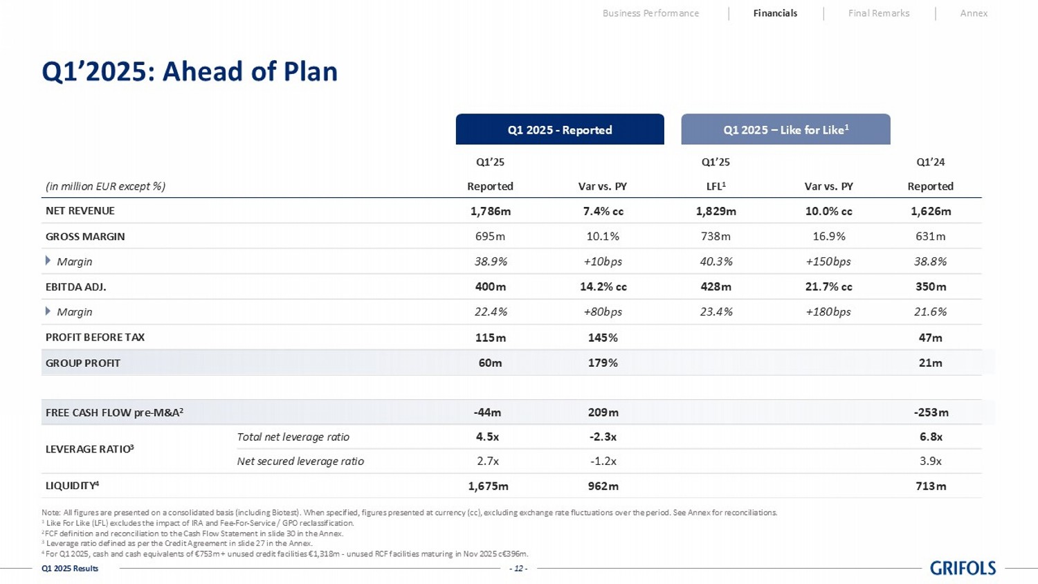 This document contains the following Alternative Performance Measures (APMs): Consolidated EBITDA Reported, Consolidated EBITDA Adjusted, Like-for-Like, Leverage Ratio as per the Credit Facility, Net Debt as per the Credit Facility, Free Cash Flow, Working Capital, and non-recurring items. For further details on the definition, explanation on the use, and reconciliation of APMs, please see the Appendix of the Presentation as well as the “Alternative Performance Measures” document from Grifols website www.grifols.com/en/investors.