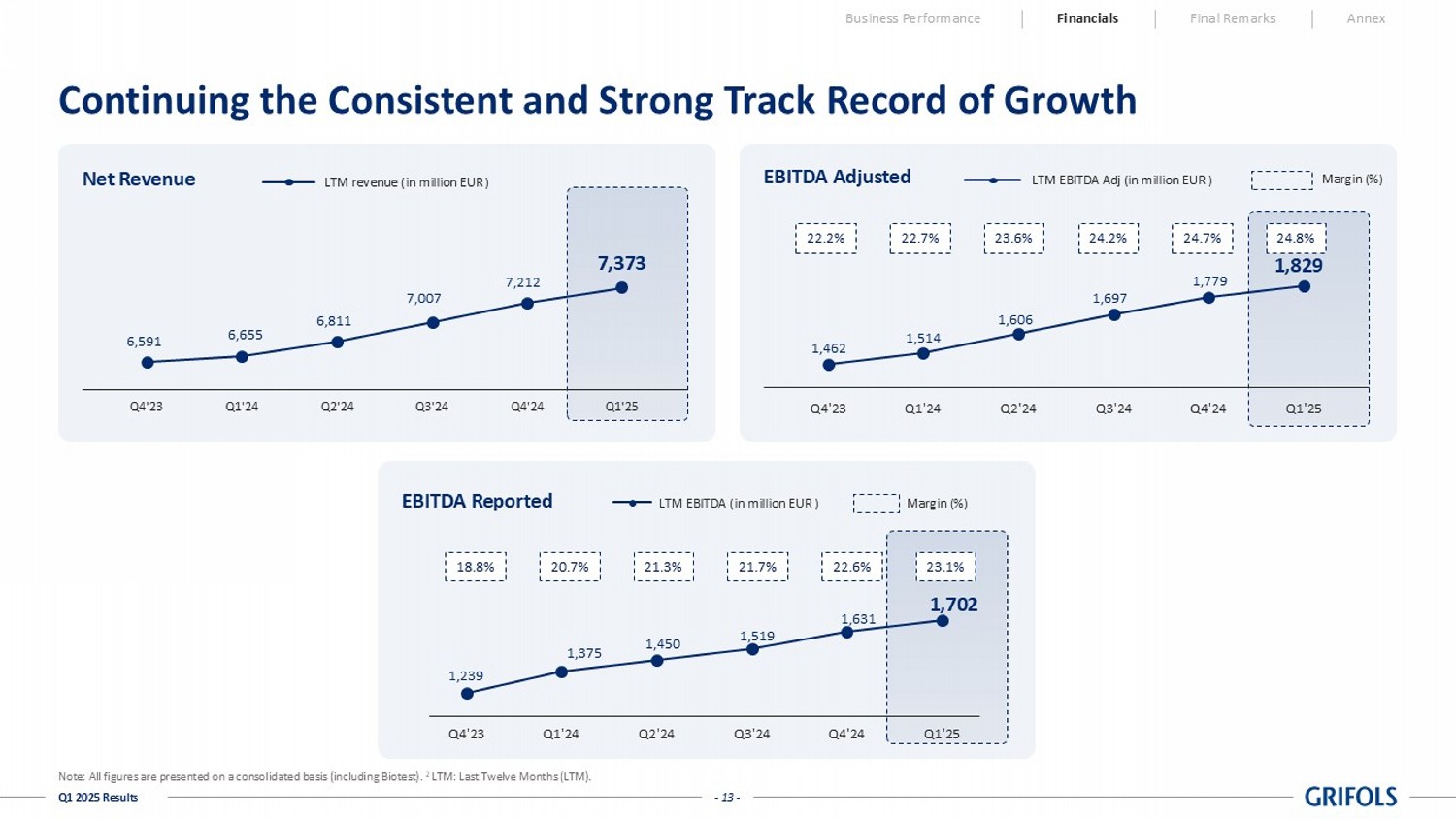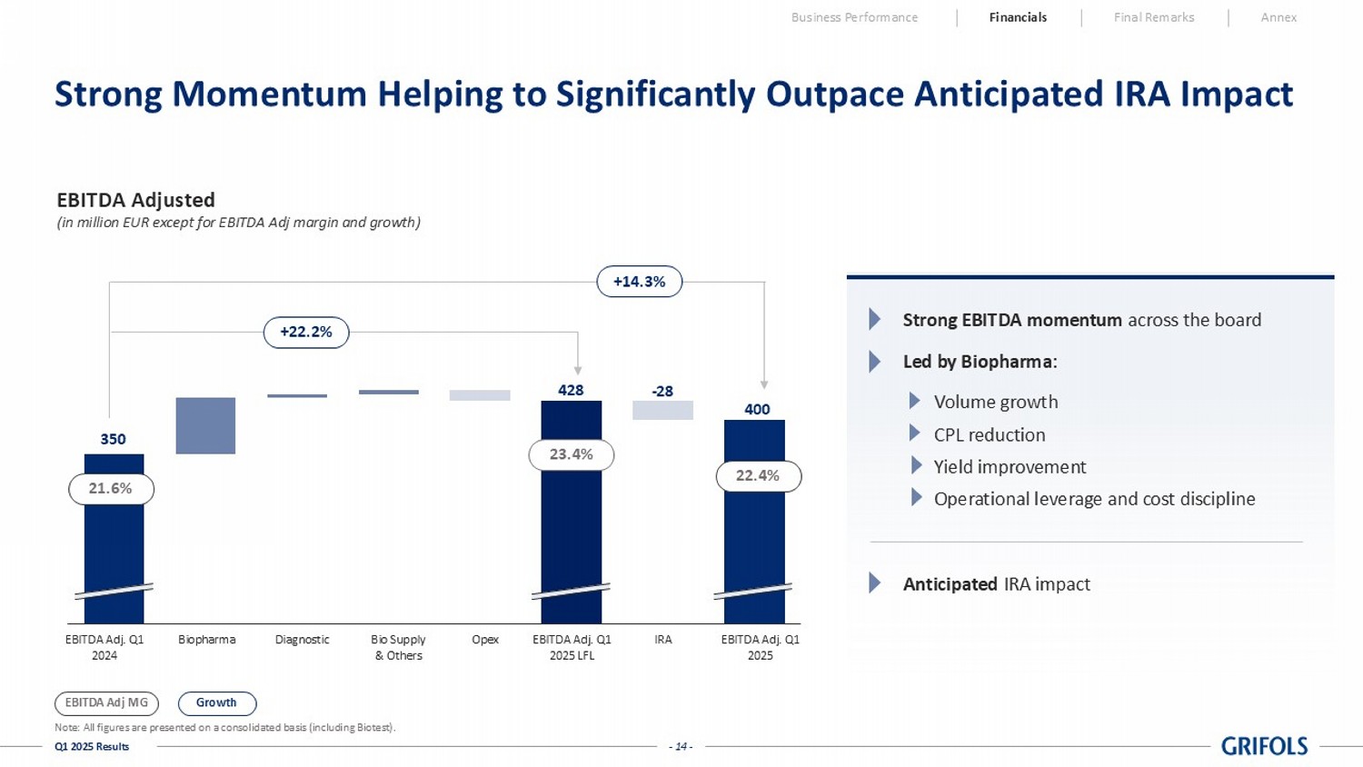 - 13 - Q1 2025 Results Continuing the Consistent and Strong Track Record of Growth Business Performance Financials Final Remarks Annex Note: All figures are presented on a consolidated basis (including Biotest). 2 LTM: Last Twelve Months (LTM). 1,462 1,514 1,606 1,697 1,779 1,829 Q4'23 Q1'24 Q2'24 Q3'24 Q4'24 Q1'25 EBITDA Adjusted LTM EBITDA Adj ( in million EUR ) Net Revenue 6,591 6,655 6,811 7,007 7,212 7,373 Q4'23 Q1'24 Q2'24 Q3'24 Q4'24 Q1'25 LTM revenue ( in million EUR ) 1,239 1,375 1,450 1,519 1,631 1,702 Q4'23 Q1'24 Q2'24 Q3'24 Q4'24 Q1'25 EBITDA Reported LTM EBITDA ( in million EUR ) Margin (%) Margin (%) 18.8% 20.7% 21.3% 21.7% 22.6% 23.1% 22.2% 22.7% 23.6% 24.2% 24.7% 24.8%