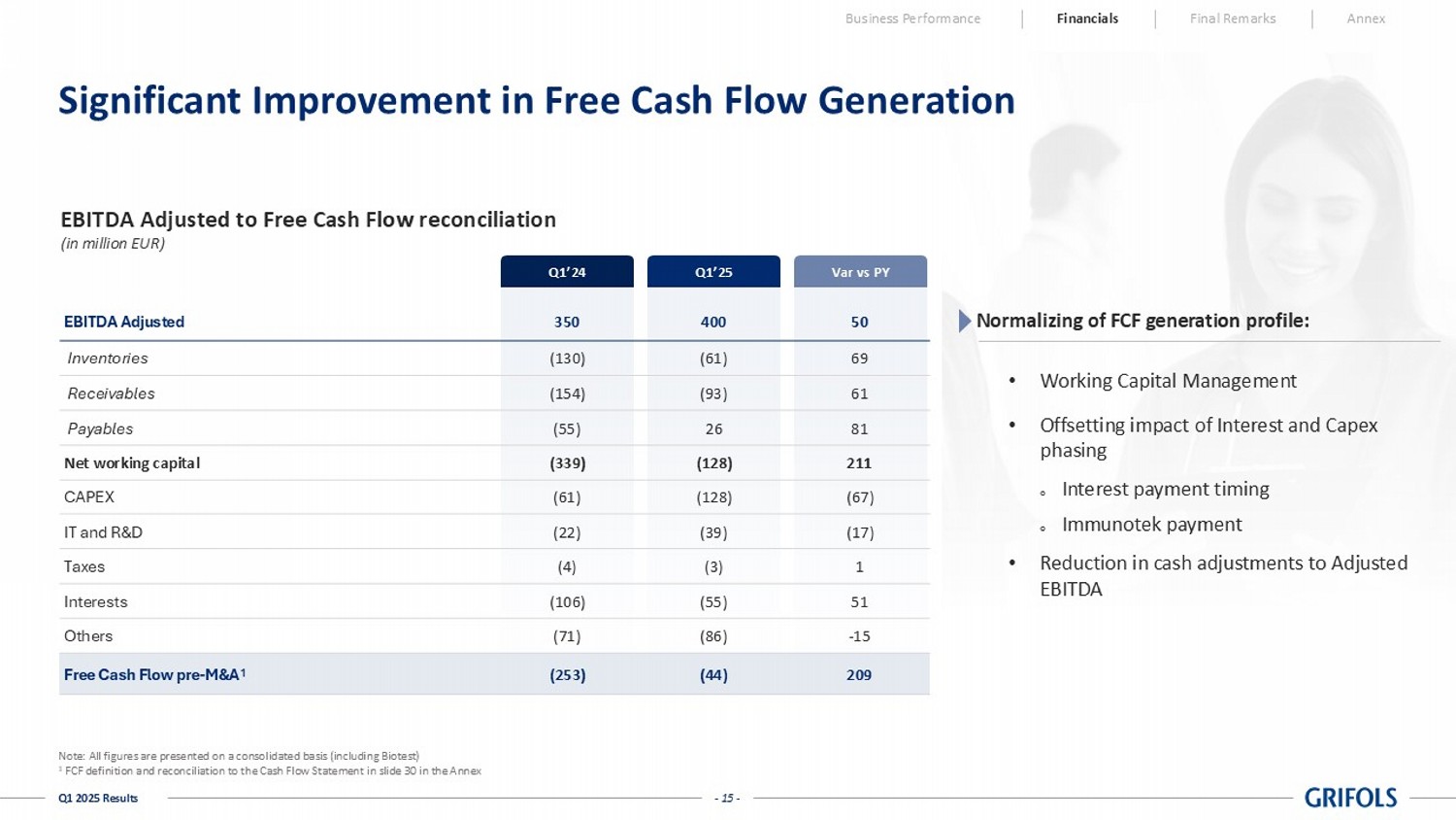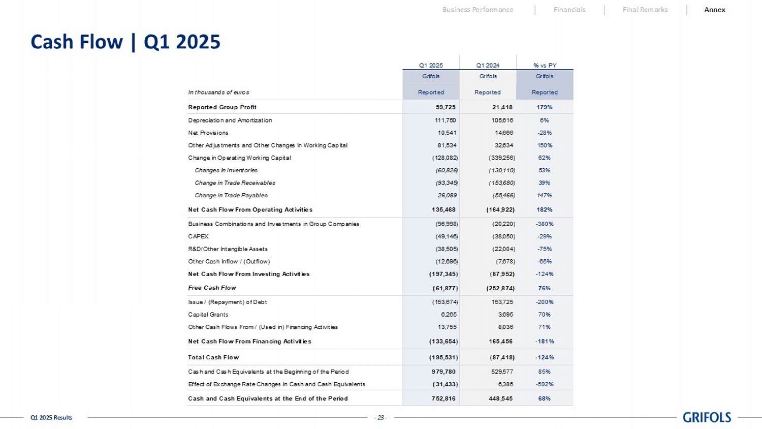 - 23 - Q1 2025 Results Cash Flow | Q1 2025 Business Performance Financials Final Remarks Annex In thousands of euros Reported Reported Reported Reported Group Profit 59,725 21,418 179% Depreciation and Amortization 111,750 105,616 6% Net Provisions 10,541 14,666 -28% Other Adjustments and Other Changes in Working Capital 81,534 32,634 150% Change in Operating Working Capital (128,082) (339,256) 62% Changes in Inventories (60,826) (130,110) 53% Change in Trade Receivables (93,345) (153,680) 39% Change in Trade Payables 26,089 (55,466) 147% Net Cash Flow From Operating Activities 135,468 (164,922) 182% Business Combinations and Investments in Group Companies (96,998) (20,220) -380% CAPEX (49,146) (38,050) -29% R&D/Other Intangible Assets (38,505) (22,004) -75% Other Cash Inflow / (Outflow) (12,696) (7,678) -65% Net Cash Flow From Investing Activities (197,345) (87,952) -124% Free Cash Flow (61,877) (252,874) 76% Issue / (Repayment) of Debt (153,674) 153,725 -200% Capital Grants 6,265 3,695 70% Other Cash Flows From / (Used in) Financing Activities 13,755 8,036 71% Net Cash Flow From Financing Activities (133,654) 165,456 -181% Total Cash Flow (195,531) (87,418) -124% Cash and Cash Equivalents at the Beginning of the Period 979,780 529,577 85% Effect of Exchange Rate Changes in Cash and Cash Equivalents (31,433) 6,386 -592% Cash and Cash Equivalents at the End of the Period 752,816 448,545 68% Q1 2025 Q1 2024 % vs PY Grifols Grifols Grifols