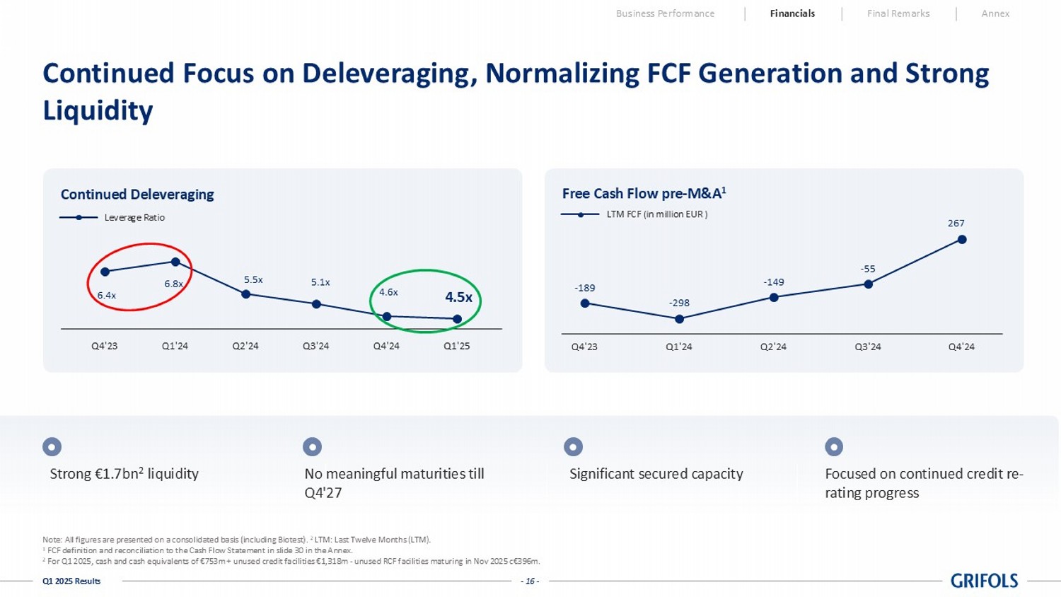 - 16 - Q1 2025 Results Business Performance Financials Final Remarks Annex Significant secured capacity Strong €1.7bn 2 liquidity Focused on continued credit re - rating progress Continued Focus on Deleveraging, Normalizing FCF Generation and Strong Liquidity - 189 - 298 - 149 - 55 267 Q4'23 Q1'24 Q2'24 Q3'24 Q4'24 Free Cash Flow pre - M&A 1 LTM FCF ( in million EUR ) Note: All figures are presented on a consolidated basis (including Biotest). 2 LTM: Last Twelve Months (LTM). 1 FCF definition and reconciliation to the Cash Flow Statement in slide 30 in the Annex. 2 For Q1 2025, cash and cash equivalents of €753m + unused credit facilities € 1,318 m - unused RCF facilities maturing in Nov 2025 c€396m. No meaningful maturities till Q4'27 Continued Deleveraging 6.4 x 6.8 x 5.5 x 5.1 x 4.6 x 4.5x Q4'23 Q1'24 Q2'24 Q3'24 Q4'24 Q1'25 Leverage Ratio