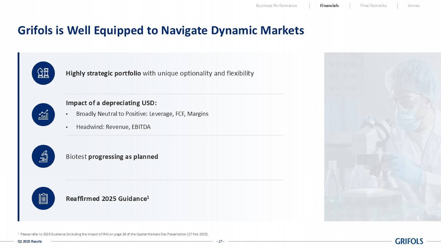 - 17 - Q1 2025 Results Grifols is Well Equipped to Navigate Dynamic Markets Business Performance Financials Final Remarks Annex Highly strategic portfolio with unique optionality and flexibility Biotest progressing as planned Reaffirmed 2025 Guidance 1 Impact of a depreciating USD: • Broadly Neutral to Positive: Leverage, FCF, Margins • Headwind: Revenue, EBITDA 1 Please refer to 2025 Guidance (including the impact of IRA) on page 38 of the Capital Markets Day Presentation (27 Feb 2025).