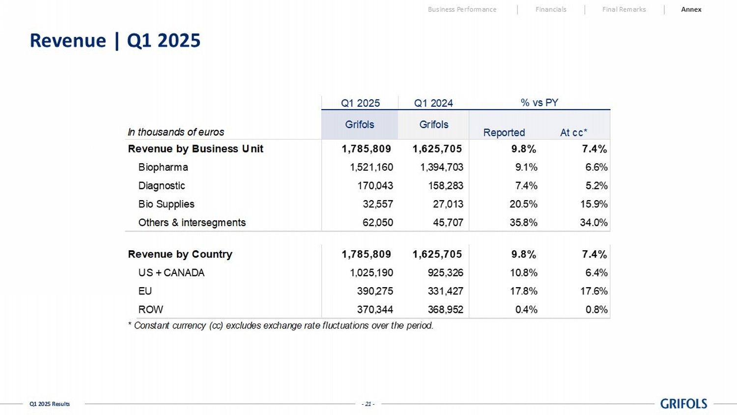 - 21 - Q1 2025 Results Revenue | Q1 2025 Q1 2025 Q1 2024 In thousands of euros Reported At cc* Revenue by Business Unit 1,785,809 1,625,705 9.8% 7.4% Biopharma 1,521,160 1,394,703 9.1% 6.6% Diagnostic 170,043 158,283 7.4% 5.2% Bio Supplies 32,557 27,013 20.5% 15.9% Others & intersegments 62,050 45,707 35.8% 34.0% Revenue by Country 1,785,809 1,625,705 9.8% 7.4% US + CANADA 1,025,190 925,326 10.8% 6.4% EU 390,275 331,427 17.8% 17.6% ROW 370,344 368,952 0.4% 0.8% * Constant currency (cc) excludes exchange rate fluctuations over the period. Grifols Grifols % vs PY Business Performance Financials Final Remarks Annex