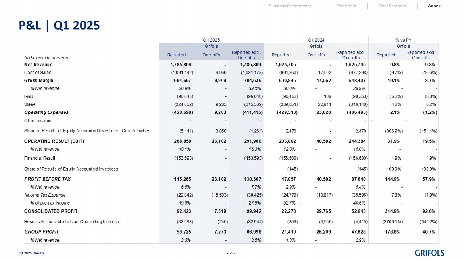 - 22 - Q1 2025 Results P&L | Q1 2025 Business Performance Financials Final Remarks Annex In thousands of euros Reported One-offs Reported excl. One-offs Reported One-offs Reported excl. One-offs Reported Reported excl. One-offs Net Revenue 1,785,809 - 1,785,809 1,625,705 - 1,625,705 9.8% 9.8% Cost of Sales (1,091,142) 9,969 (1,081,173) (994,860) 17,562 (977,298) (9.7%) (10.6%) Gross Margin 694,667 9,969 704,636 630,845 17,562 648,407 10.1% 8.7% % Net revenue 38.9% - 39.5% 38.8% - 39.9% - - R&D (96,046) - (96,046) (90,462) 109 (90,353) (6.2%) (6.3%) SG&A (324,652) 9,283 (315,369) (339,051) 22,911 (316,140) 4.2% 0.2% Operating Expenses (420,698) 9,283 (411,415) (429,513) 23,020 (406,493) 2.1% (1.2%) Other Income - - - - - - - - (5,111) 3,850 (1,261) 2,470 - 2,470 (306.9%) (151.1%) OPERATING RESULT (EBIT) 268,858 23,102 291,960 203,802 40,582 244,384 31.9% 19.5% % Net revenue 15.1% - 16.3% 12.5% - 15.0% - - Financial Result (153,593) - (153,593) (156,600) - (156,600) 1.9% 1.9% - - - (145) - (145) 100.0% 100.0% PROFIT BEFORE TAX 115,265 23,102 138,367 47,057 40,582 87,640 144.9% 57.9% % Net revenue 6.5% - 7.7% 2.9% - 5.4% - - Income Tax Expense (22,842) (15,583) (38,425) (24,779) (10,817) (35,596) 7.8% (7.9%) % of pre-tax income 19.8% - 27.8% 52.7% - 40.6% - - CONSOLIDATED PROFIT 92,423 7,519 99,942 22,278 29,765 52,043 314.9% 92.0% Results Attributable to Non-Controlling Interests (32,698) (246) (32,944) (859) (3,556) (4,415) (3706.5%) (646.2%) GROUP PROFIT 59,725 7,273 66,998 21,419 26,209 47,628 178.8% 40.7% % Net revenue 3.3% - 3.8% 1.3% - 2.9% Q1 2025 % vs PY Share of Results of Equity Accounted Investees Share of Results of Equity Accounted Investees - Core Activities Grifols GrifolsGrifols Q1 2024
