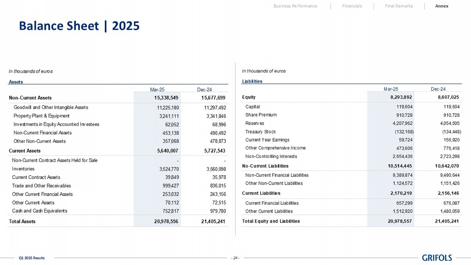 - 24 - Q1 2025 Results Balance Sheet | 2025 Business Performance Financials Final Remarks Annex In thousands of euros Mar-25 Dec-24 15,338,549 15,677,699 11,225,180 11,297,492 3,241,111 3,341,846 62,052 68,996 453,138 490,492 357,068 478,873 5,640,007 5,727,543 - - 3,524,770 3,560,098 39,849 35,978 999,427 836,015 253,032 243,156 70,112 72,515 752,817 979,780 20,978,556 21,405,241 Cash and Cash Equivalents Goodwill and Other Intangible Assets Property Plant & Equipment Assets Non-Current Assets Total Assets Current Assets Inventories Current Contract Assets Other Current Financial Assets Non-Current Contract Assets Held for Sale Trade and Other Receivables Investments in Equity Accounted Investees Non-Current Financial Assets Other Non-Current Assets Other Current Assets In thousands of euros Mar-25 Dec-24 8,293,892 8,607,025 119,604 119,604 910,728 910,728 4,207,962 4,054,505 Treasury Stock (132,168) (134,448) 59,724 156,920 473,606 776,418 2,654,436 2,723,298 10,514,445 10,642,070 9,389,874 9,490,644 1,124,572 1,151,426 2,170,219 2,156,146 657,299 676,087 1,512,920 1,480,059 20,978,557 21,405,241 Other Current Liabilities Total Equity and Liabilities Other Comprehensive Income Non-Controllling Interests No-Current Liabilities Non-Current Financial Liabilities Other Non-Current Liabilities Share Premium Reserves Current Year Earnings Current Liabilities Current Financial Liabilities Capital Equity Liabilities