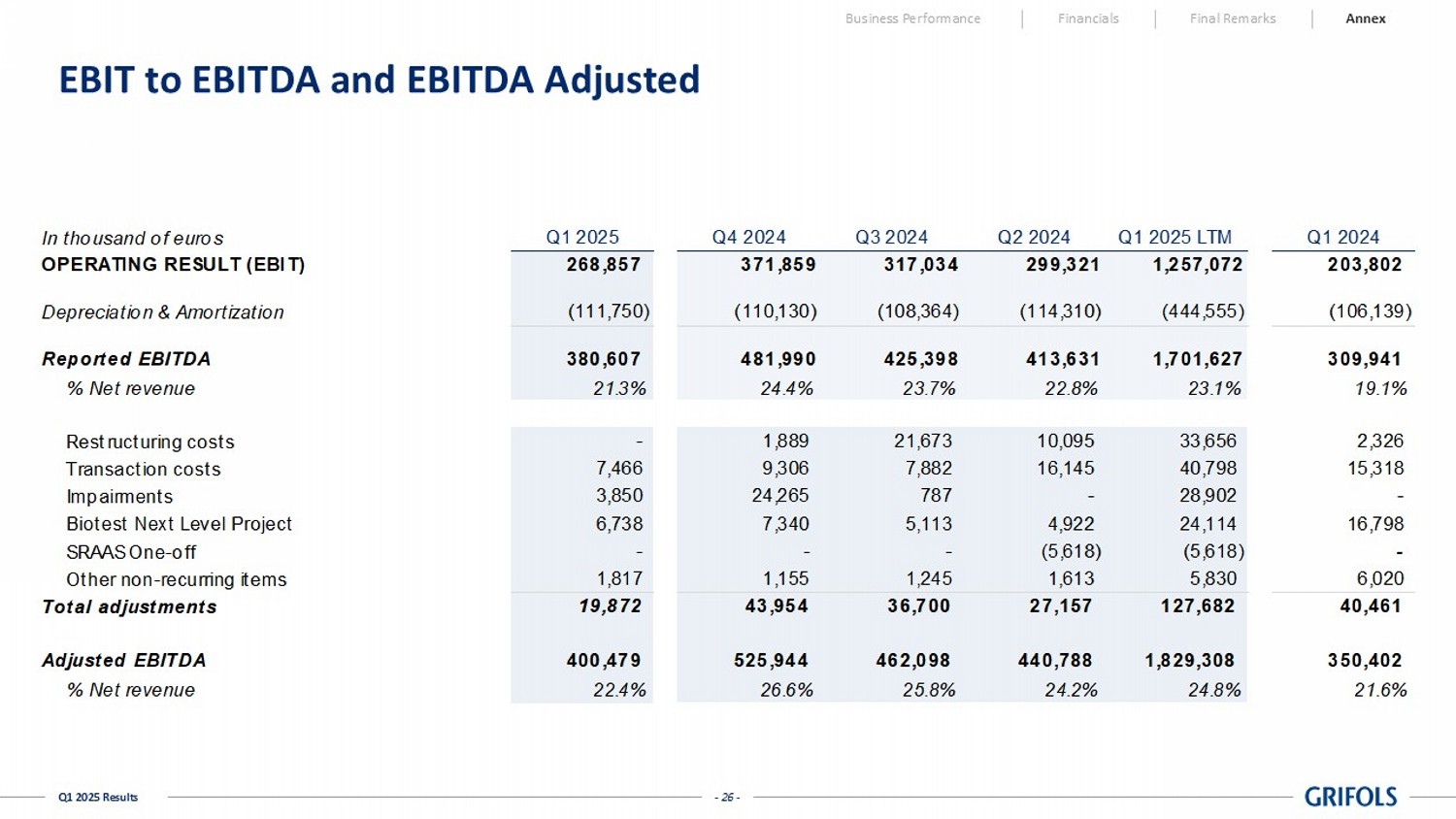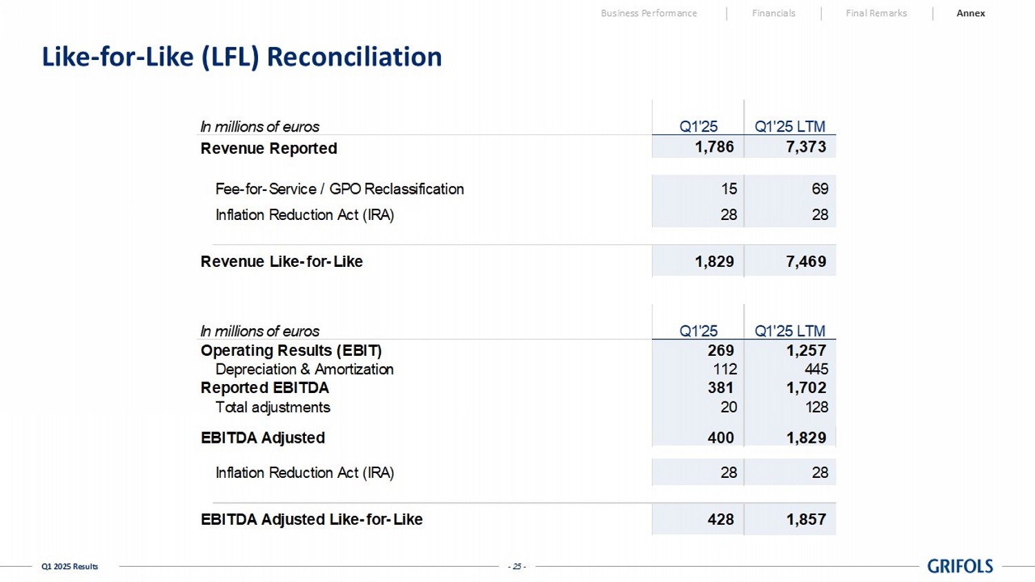- 25 - Q1 2025 Results Like - for - Like (LFL) Reconciliation Business Performance Financials Final Remarks Annex In millions of euros Q1'25 Q1'25 LTM Revenue Reported 1,786 7,373 Fee-for-Service / GPO Reclassification 15 69 Inflation Reduction Act (IRA) 28 28 Revenue Like-for-Like 1,829 7,469 In millions of euros Q1'25 Q1'25 LTM Operating Results (EBIT) 269 1,257 Depreciation & Amortization 112 445 Reported EBITDA 381 1,702 Total adjustments 20 128 EBITDA Adjusted 400 1,829 Inflation Reduction Act (IRA) 28 28 EBITDA Adjusted Like-for-Like 428 1,857