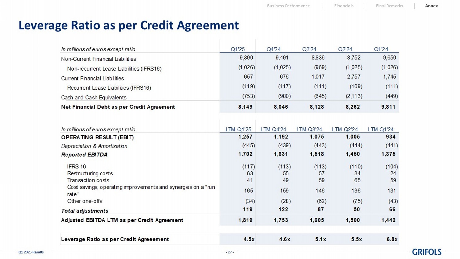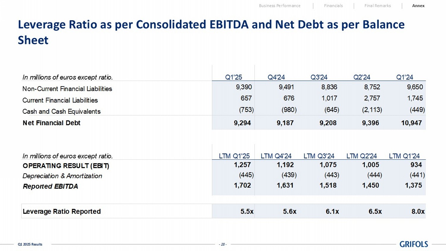 - 27 - Q1 2025 Results Leverage Ratio as per Credit Agreement Business Performance Financials Final Remarks Annex In millions of euros except ratio. Q1'25 Q4'24 Q3'24 Q2'24 Q1'24 Non-Current Financial Liabilities 9,390 9,491 8,836 8,752 9,650 Non-recurrent Lease Liabilities (IFRS16) (1,026) (1,025) (969) (1,025) (1,026) Current Financial Liabilities 657 676 1,017 2,757 1,745 Recurrent Lease Liabilities (IFRS16) (119) (117) (111) (109) (111) Cash and Cash Equivalents (753) (980) (645) (2,113) (449) Net Financial Debt as per Credit Agreement 8,149 8,046 8,128 8,262 9,811 In millions of euros except ratio. LTM Q1'25 LTM Q4'24 LTM Q3'24 LTM Q2'24 LTM Q1'24 OPERATING RESULT (EBIT) 1,257 1,192 1,075 1,005 934 Depreciation & Amortization (445) (439) (443) (444) (441) Reported EBITDA 1,702 1,631 1,518 1,450 1,375 IFRS 16 (117) (113) (113) (110) (104) Restructuring costs 63 55 57 34 24 Transaction costs 41 49 59 65 59 Cost savings, operating improvements and synergies on a "run rate" 165 159 146 136 131 Other one-offs (34) (28) (62) (75) (43) Total adjustments 119 122 87 50 66 Adjusted EBITDA LTM as per Credit Agreement 1,819 1,753 1,605 1,500 1,442 Leverage Ratio as per Credit Agreeement 4.5x 4.6x 5.1x 5.5x 6.8x