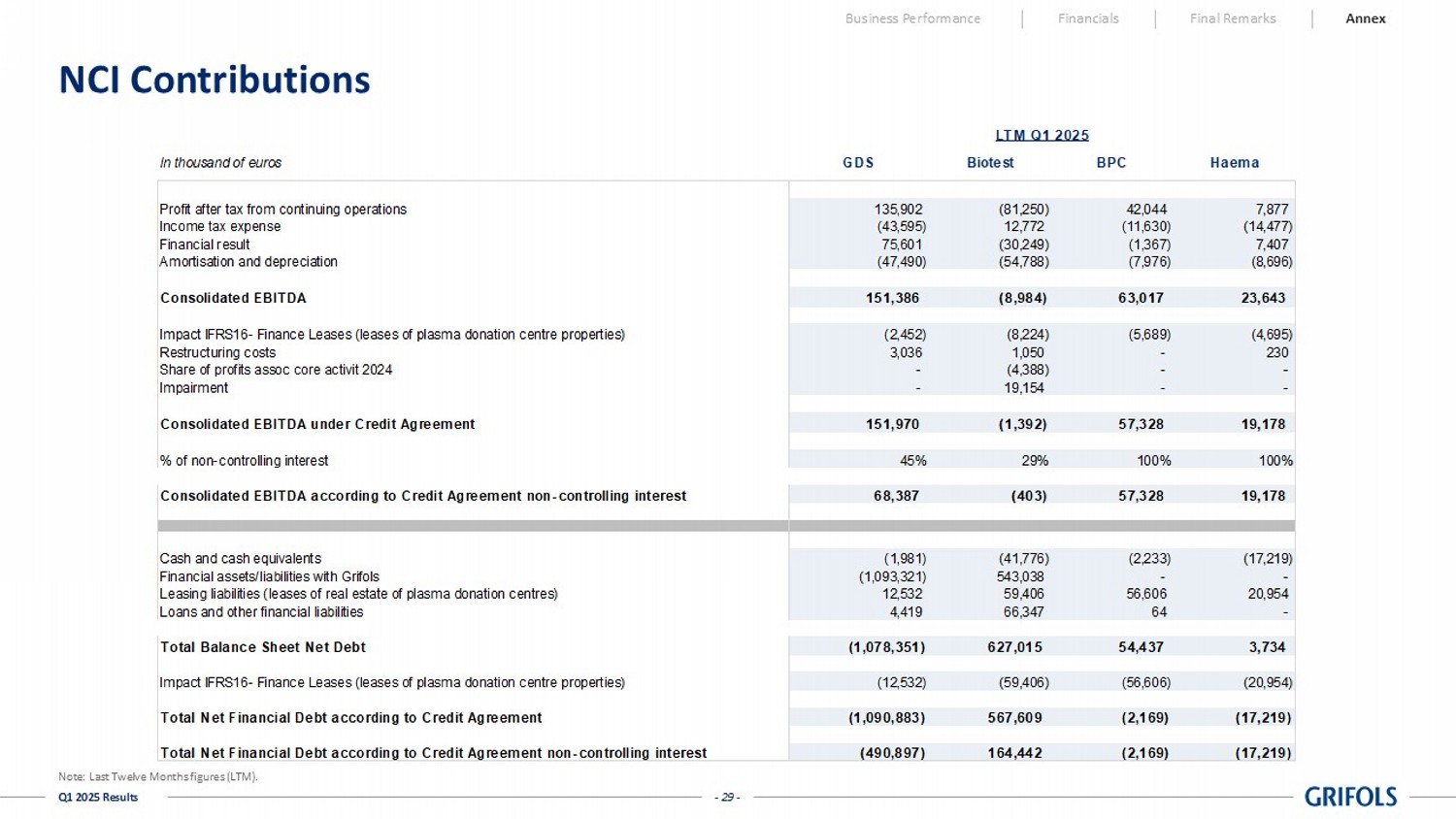 - 29 - Q1 2025 Results NCI Contributions Business Performance Financials Final Remarks Annex In thousand of euros GDS Biotest BPC Haema Profit after tax from continuing operations 135,902 (81,250) 42,044 7,877 Income tax expense (43,595) 12,772 (11,630) (14,477) Financial result 75,601 (30,249) (1,367) 7,407 Amortisation and depreciation (47,490) (54,788) (7,976) (8,696) Consolidated EBITDA 151,386 (8,984) 63,017 23,643 Impact IFRS16- Finance Leases (leases of plasma donation centre properties) (2,452) (8,224) (5,689) (4,695) Restructuring costs 3,036 1,050 - 230 Share of profits assoc core activit 2024 - (4,388) - - Impairment - 19,154 - - Consolidated EBITDA under Credit Agreement 151,970 (1,392) 57,328 19,178 % of non-controlling interest 45% 29% 100% 100% Consolidated EBITDA according to Credit Agreement non-controlling interest 68,387 (403) 57,328 19,178 Cash and cash equivalents (1,981) (41,776) (2,233) (17,219) Financial assets/liabilities with Grifols (1,093,321) 543,038 - - Leasing liabilities (leases of real estate of plasma donation centres) 12,532 59,406 56,606 20,954 Loans and other financial liabilities 4,419 66,347 64 - Total Balance Sheet Net Debt (1,078,351) 627,015 54,437 3,734 Impact IFRS16- Finance Leases (leases of plasma donation centre properties) (12,532) (59,406) (56,606) (20,954) Total Net Financial Debt according to Credit Agreement (1,090,883) 567,609 (2,169) (17,219) Total Net Financial Debt according to Credit Agreement non-controlling interest (490,897) 164,442 (2,169) (17,219) LTM Q1 2025 Note: Last Twelve Months figures (LTM).