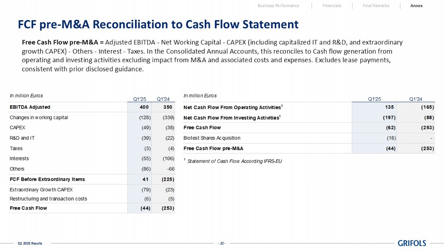 - 30 - Q1 2025 Results FCF pre - M&A Reconciliation to Cash Flow Statement Free Cash Flow pre - M&A = Adjusted EBITDA - Net Working Capital - CAPEX (including capitalized IT and R&D, and extraordinary growth CAPEX) - Others - Interest - Taxes. In the Consolidated Annual Accounts, this reconciles to Cash flow generation from operating and investing activities excluding impact from M&A and associated costs and expenses. Excludes lease payments, consistent with prior disclosed guidance. Business Performance Financials Final Remarks Annex In million Euros Q1'25 Q1'24 In million Euros Q1'25 Q1'24 EBITDA Adjusted 400 350 Net Cash Flow From Operating Activities 1 135 (165) Changes in working capital (128) (339) Net Cash Flow From Investing Activities 1 (197) (88) CAPEX (49) (38) Free Cash Flow (62) (253) R&D and IT (39) (22) Biotest Shares Acquisition (18) - Taxes (3) (4) Free Cash Flow pre-M&A (44) (253) Interests (55) (106) Others (86) -66 FCF Before Extraordinary Items 41 (225) Extraordinary Growth CAPEX (79) (23) Restructuring and transaction costs (6) (5) Free Cash Flow (44) (253) 1 Statement of Cash Flow According IFRS-EU