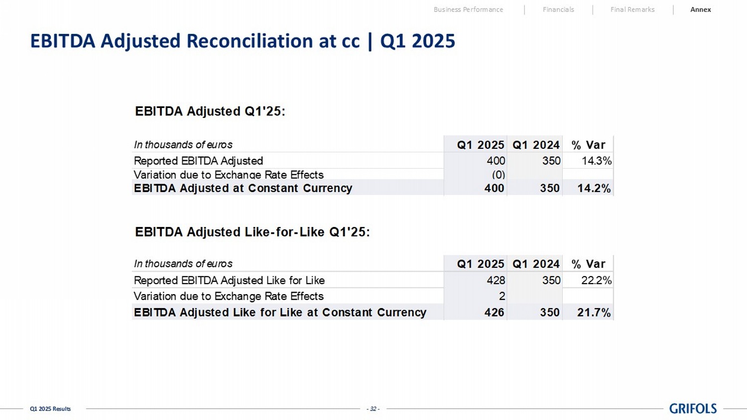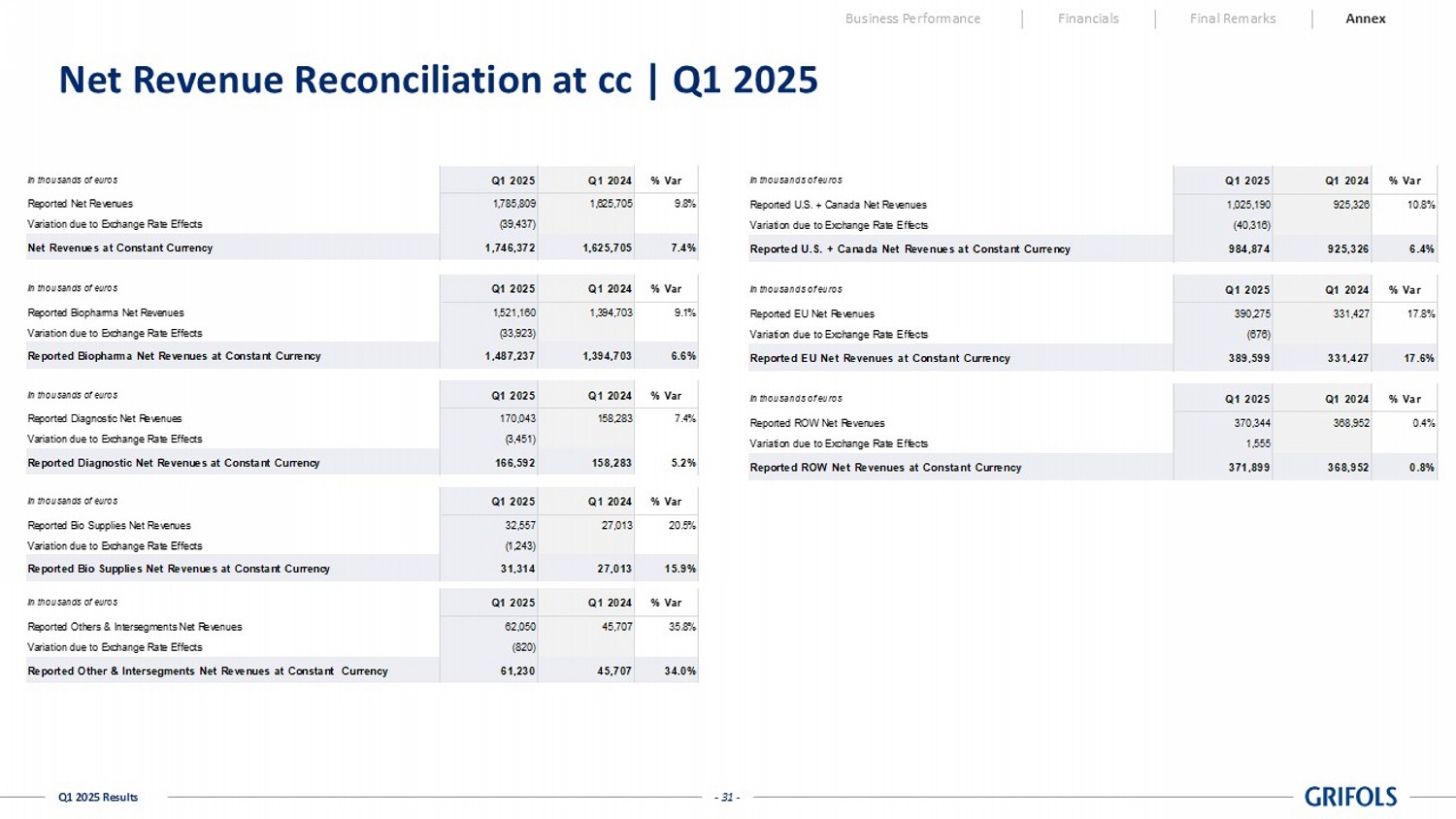 - 31 - Q1 2025 Results Net Revenue Reconciliation at cc | Q1 2025 In thousands of euros Q1 2025 Q1 2024 % Var Reported U.S. + Canada Net Revenues 1,025,190 925,326 10.8% Variation due to Exchange Rate Effects (40,316) Reported U.S. + Canada Net Revenues at Constant Currency 984,874 925,326 6.4% In thousands of euros Q1 2025 Q1 2024 % Var Reported EU Net Revenues 390,275 331,427 17.8% Variation due to Exchange Rate Effects (676) Reported EU Net Revenues at Constant Currency 389,599 331,427 17.6% In thousands of euros Q1 2025 Q1 2024 % Var Reported ROW Net Revenues 370,344 368,952 0.4% Variation due to Exchange Rate Effects 1,555 Reported ROW Net Revenues at Constant Currency 371,899 368,952 0.8% In thousands of euros Q1 2025 Q1 2024 % Var Reported Net Revenues 1,785,809 1,625,705 9.8% Variation due to Exchange Rate Effects (39,437) Net Revenues at Constant Currency 1,746,372 1,625,705 7.4% In thousands of euros Q1 2025 Q1 2024 % Var Reported Biopharma Net Revenues 1,521,160 1,394,703 9.1% Variation due to Exchange Rate Effects (33,923) Reported Biopharma Net Revenues at Constant Currency 1,487,237 1,394,703 6.6% In thousands of euros Q1 2025 Q1 2024 % Var Reported Diagnostic Net Revenues 170,043 158,283 7.4% Variation due to Exchange Rate Effects (3,451) Reported Diagnostic Net Revenues at Constant Currency 166,592 158,283 5.2% In thousands of euros Q1 2025 Q1 2024 % Var Reported Bio Supplies Net Revenues 32,557 27,013 20.5% Variation due to Exchange Rate Effects (1,243) Reported Bio Supplies Net Revenues at Constant Currency 31,314 27,013 15.9% In thousands of euros Q1 2025 Q1 2024 % Var Reported Others & Intersegments Net Revenues 62,050 45,707 35.8% Variation due to Exchange Rate Effects (820) Reported Other & Intersegments Net Revenues at Constant Currency 61,230 45,707 34.0% Business Performance Financials Final Remarks Annex