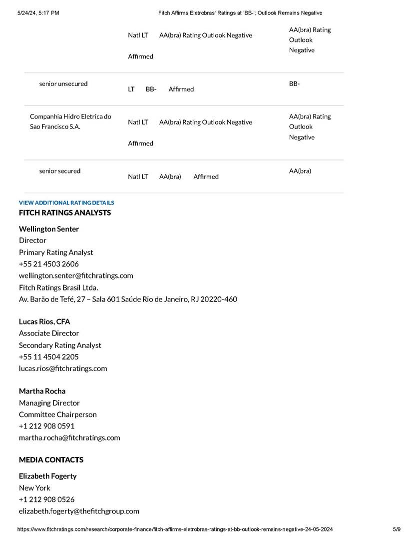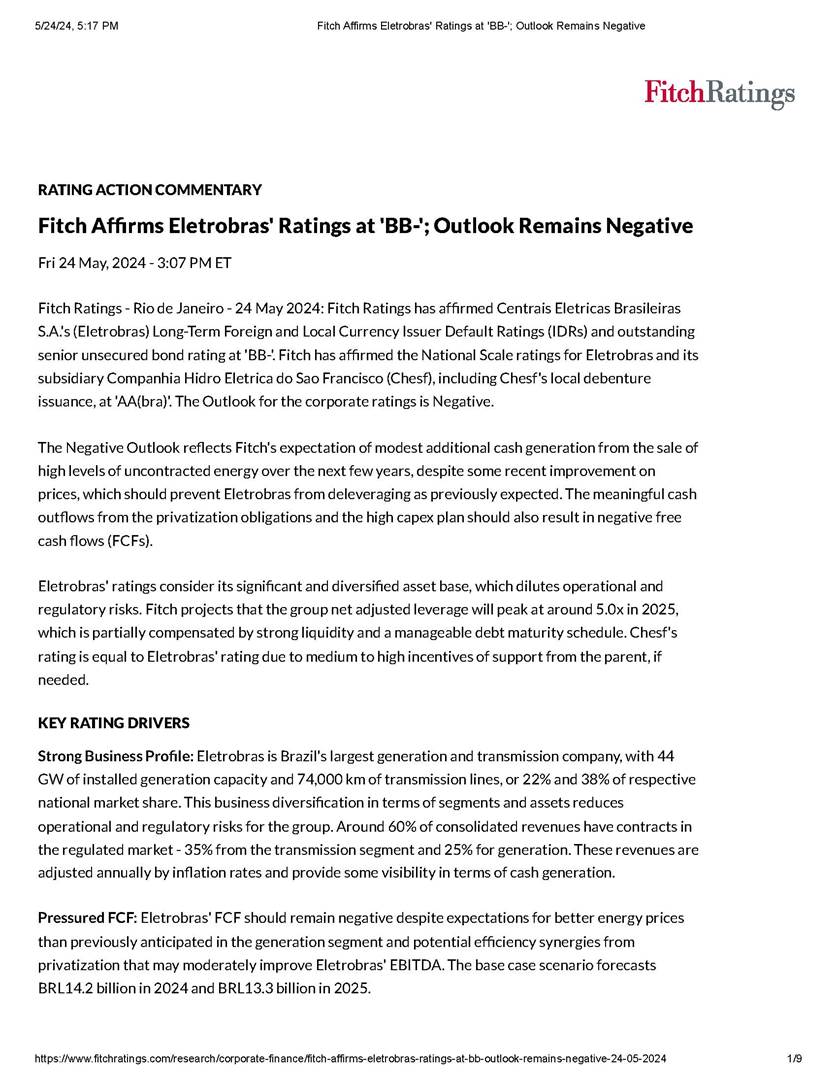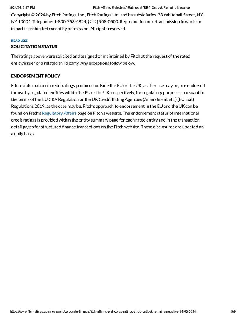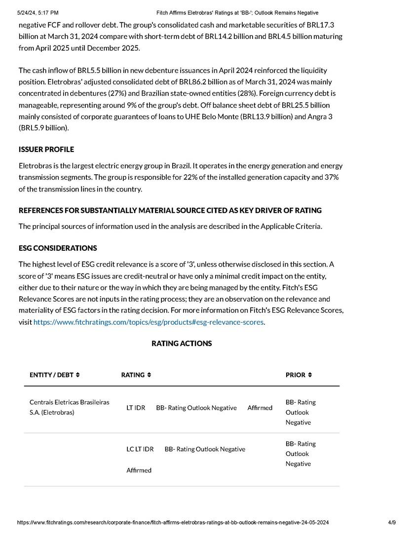 Rio de Janeiro, May 24, 2024, Centrais Elétricas Brasileiras S/A – Eletrobras informs that the rating agency Fitch has reaffirmed Eletrobras' Long-Term local and foreign currency ratings at BB- and Long-Term National-Scale at AA (bra), maintaining the negative outlook.