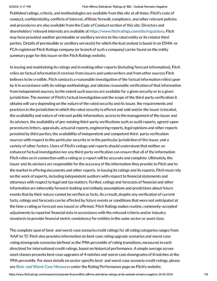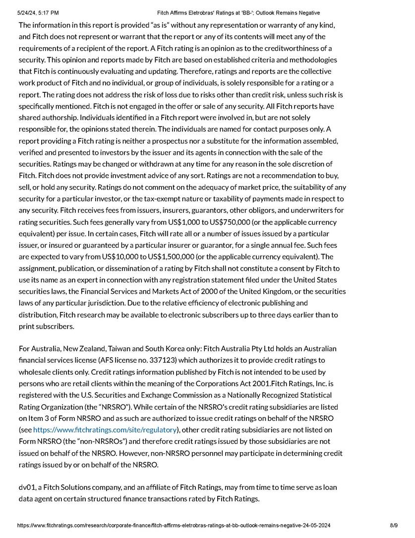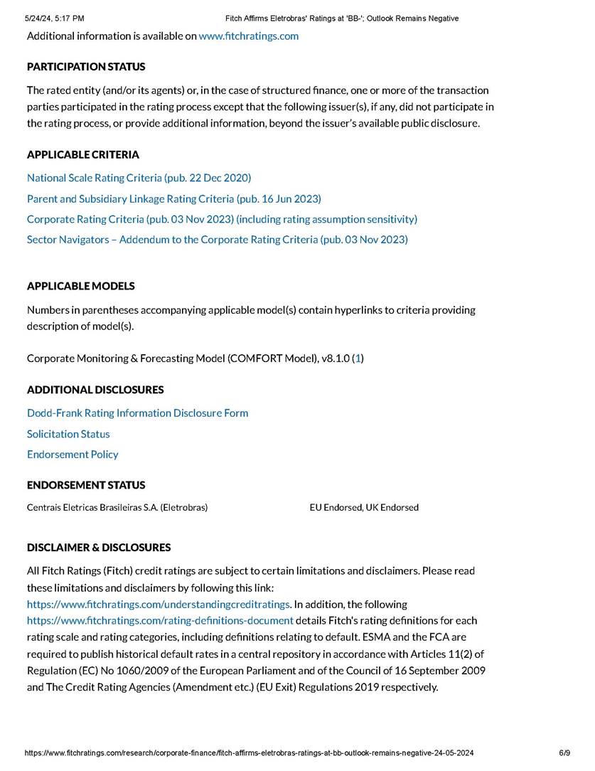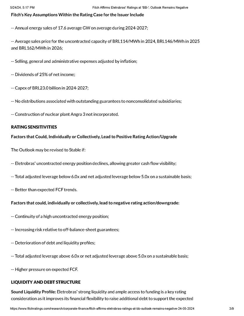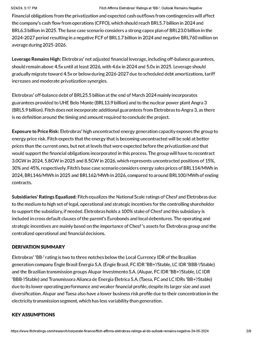 Rio de Janeiro, May 24, 2024, Centrais Elétricas Brasileiras S/A – Eletrobras informs that the rating agency Fitch has reaffirmed Eletrobras' Long-Term local and foreign currency ratings at BB- and Long-Term National-Scale at AA (bra), maintaining the negative outlook.