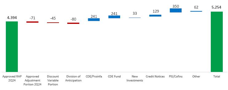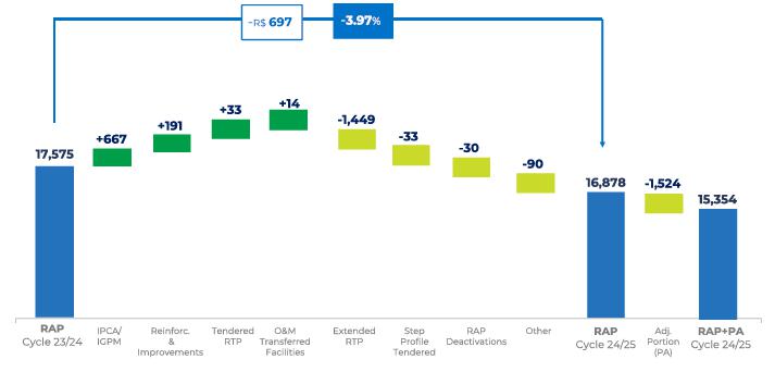 The revision of the RAP offered in auction generated a nominal economic repositioning index (IRT) of 4.36% and a RAP increase of R$ 22 million, while the RAP for reinforcements and improvements led to an IRT of 9.11% and a RAP increase of R$ 6 million. The main impacts on the revision of the RAP offered in auction are: (i) updating the cost of Third Party Capital, (ii) capturing R$70,000 of other revenues in favor of tariff modicity, and (iii) no reduction in the portion relating to O&M RAP in the period, given that the percentage of business efficiency gain applied in the periodic reviews between July/20 and June/25 will be 0.0% (ANEEL Normative Resolution No. 1,091/2024). Finally, a positive Retroactivity PA was established in the amount of R$21 million to be paid over the next 5 tariff cycles, at Jun/24 prices.