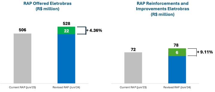 As a result of this process, on July 11, 2024, ANEEL published two Homologatory Resolutions: Homologatory Resolution No. 3,342, which approved the supplementary result of the Periodic Tariff Reviews of the 2023 RAP of the Transmission Concession Contracts 004/2008, 005/2008, 007/2008, 020/2012; and Homologatory Resolution No. 3,343, which approved the result of the Periodic Tariff Reviews of RAP 2024 of Concession Contracts 034/2001, 004/2004, 006/2005, 007/2005, 005/2006, 007/2006, 014/2008, 001/2009, 002/2009, 003/2009, 005/2009, 006/2009, 010/2009, 012/2009, 007/2014 and 008/2014. It should be noted that the regulator has postponed the review of the Reinforcements and Improvements of the Tendered Transmission Companies from July 1, 2023 to July 1, 2024.