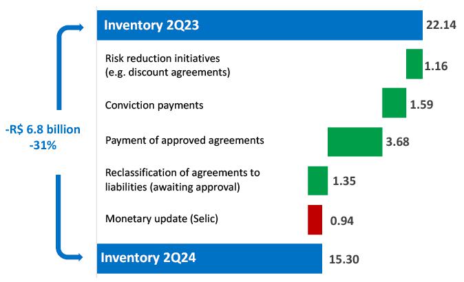 Since 3Q22, when negotiations began and the inventory of provisions for lawsuits involving book-entry compulsory loan credits was R$25.8 billion, the provisions inventory was reduced by R$10.5 billion, despite the accrued monetary restatement of R$1.9 billion between the periods, which is in line with the Company's strategy of reducing legal liabilities. The legal agreements reached led to the elimination of off-balance sheet risk amounting to R$6.9 billion, of which R$698 million is classified as possible while R$6.1 billion is classified as remote.