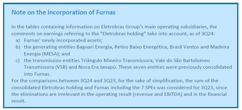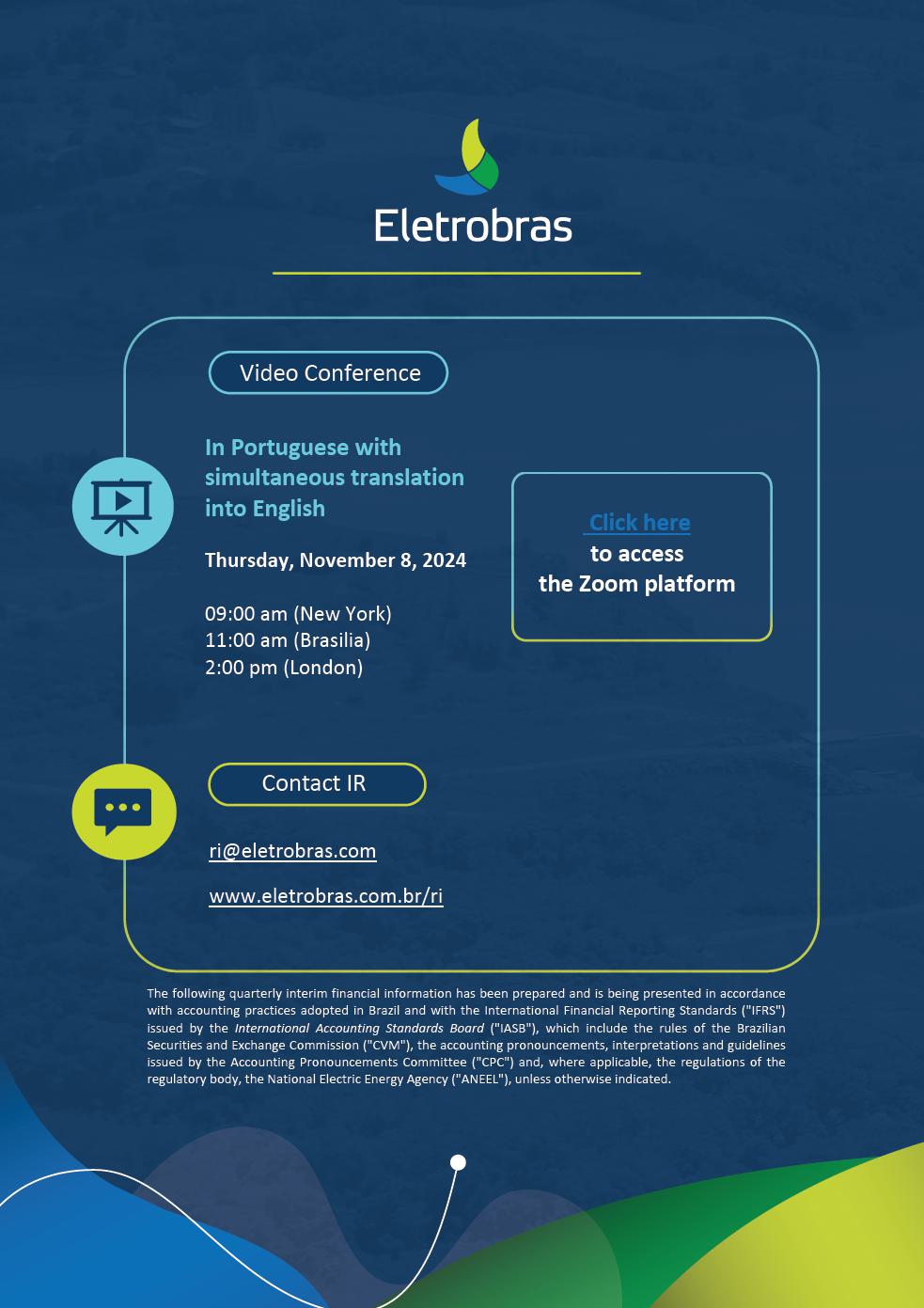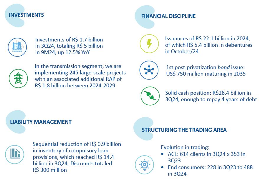 Eletrobras' operating and financial results in 3Q24 reinforce its solid financial position, enabling the Company to accelerate investments in asset modernization, expansion through transmission or generation auctions, operational streamlining and the effective reduction of legacy liabilities and contingencies.
