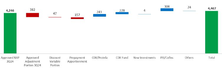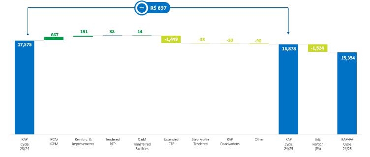 R$ 695 million YoY reduction in RAP due to the 2024 RTP, of which R$ 328 million refers to PA Postponement