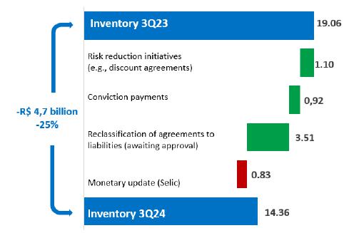 Since 3Q22, when negotiations began and the inventory of provisions for lawsuits involving book-entry compulsory loan credits was R$25.8 billion, the provisions inventory was reduced by R$11.4 billion, despite the accrued monetary restatement of R$2.1 billion between the periods, which is in line with the Company's strategy of reducing legal liabilities.