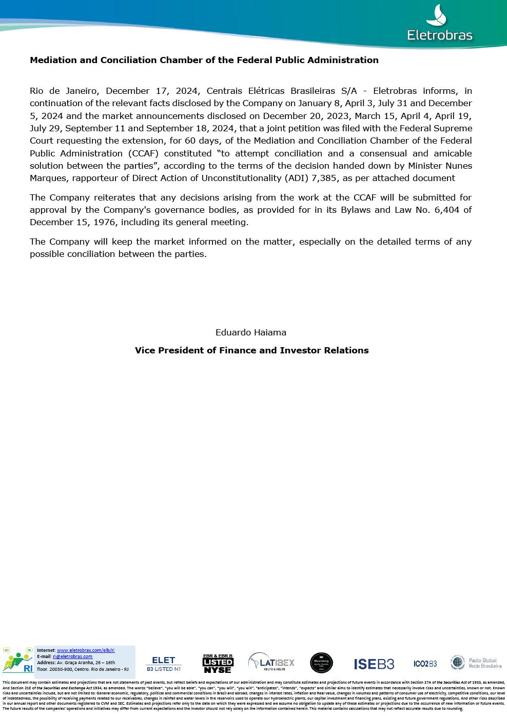 Mediation and Conciliation Chamber of the Federal Public Administration Rio de Janeiro, December 17, 2024, Centrais Elétricas Brasileiras S/A - Eletrobras informs, in continuation of the relevant facts disclosed by the Company on January 8, April 3, July 31 and December 5, 2024 and the market announcements disclosed on December 20, 2023, March 15, April 4, April 19, July 29, September 11 and September 18, 2024, that a joint petition was filed with the Federal Supreme Court requesting the extension, for 60 days, of the Mediation and Conciliation Chamber of the Federal Public Administration (CCAF) constituted “to attempt conciliation and a consensual and amicable solution between the parties”, according to the terms of the decision handed down by Minister Nunes Marques, rapporteur of Direct Action of Unconstitutionality (ADI) 7,385, as per attached document The Company reiterates that any decisions arising from the work at the CCAF will be submitted for approval by the Company's governance bodies, as provided for in its Bylaws and Law No. 6,404 of December 15, 1976, including its general meeting. The Company will keep the market informed on the matter, especially on the detailed terms of any possible conciliation between the parties. Eduardo Haiama Vice President of Finance and Investor Relations This document may contain estimates and projections that are not statements of past events, but reflect beliefs and expectations of our administration and may constitute estimates and projections of future events in accordance with Section 27A of the Securities Act of 1933, as amended, And Section 21E of the Securities and Exchange Act 1934, as amended. The words “believe”, “you will be able”, “you can”, “you will”, “you will”, “anticipates”, “intends”, “expects” and similar aims to identify estimates that necessarily involve risks and uncertainties, known or not. Known risks and uncertainties include, but are not limited to: General economic, regulatory, political and commercial conditions in Brazil and abroad, changes in interest rates, inflation and Real value, changes in volumes and patterns of consumer use of electricity, competitive conditions, our level of indebtedness, the possibility of receiving payments related to our receivables, changes in rainfall and water levels in the reservoirs used to operate our hydroelectric plants, our capital investment and financing plans, existing and future government regulations, And other risks described in our annual report and other documents registered to CVM and SEC. Estimates and projections refer only to the date on which they were expressed and we assume no obligation to update any of these estimates or projections due to the occurrence of new information or future events. The future results of the companies' operations and initiatives may differ from current expectations and the investor should not rely solely on the information contained herein. This material contains calculations that may not reflect accurate results due to rounding.