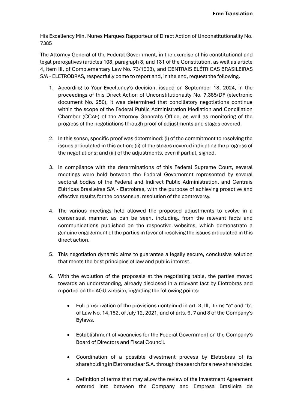 His Excellency Min. Nunes Marques Rapporteur of Direct Action of Unconstitutionality No. 7385 The Attorney General of the Federal Government, in the exercise of his constitutional and legal prerogatives (articles 103, paragraph 3, and 131 of the Constitution, as well as article 4, item III, of Complementary Law No. 73/1993), and CENTRAIS ELÉTRICAS BRASILEIRAS S/A - ELETROBRAS, respectfully come to report and, in the end, request the following. 1. According to Your Excellency's decision, issued on September 18, 2024, in the proceedings of this Direct Action of Unconstitutionality No. 7,385/DF (electronic document No. 250), it was determined that conciliatory negotiations continue within the scope of the Federal Public Administration Mediation and Conciliation Chamber (CCAF) of the Attorney General's Office, as well as monitoring of the progress of the negotiations through proof of adjustments and stages covered. 2. In this sense, specific proof was determined: (i) of the commitment to resolving the issues articulated in this action; (ii) of the stages covered indicating the progress of the negotiations; and (iii) of the adjustments, even if partial, signed. 3. In compliance with the determinations of this Federal Supreme Court, several meetings were held between the Federal Governemnt represented by several sectoral bodies of the Federal and Indirect Public Administration, and Centrais Elétricas Brasileiras S/A - Eletrobras, with the purpose of achieving proactive and effective results for the consensual resolution of the controversy. 4. The various meetings held allowed the proposed adjustments to evolve in a consensual manner, as can be seen, including, from the relevant facts and communications published on the respective websites, which demonstrate a genuine engagement of the parties in favor of resolving the issues articulated in this direct action. 5. This negotiation dynamic aims to guarantee a legally secure, conclusive solution that meets the best principles of law and public interest. 6. With the evolution of the proposals at the negotiating table, the parties moved towards an understanding, already disclosed in a relevant fact by Eletrobras and reported on the AGU website, regarding the following points: • Full preservation of the provisions contained in art. 3, III, items "a" and "b", of Law No. 14,182, of July 12, 2021, and of arts. 6, 7 and 8 of the Company's Bylaws. • Establishment of vacancies for the Federal Government on the Company's Board of Directors and Fiscal Council. • Coordination of a possible divestment process by Eletrobras of its shareholding in Eletronuclear S.A. through the search for a new shareholder. • Definition of terms that may allow the review of the Investment Agreement entered into between the Company and Empresa Brasileira de