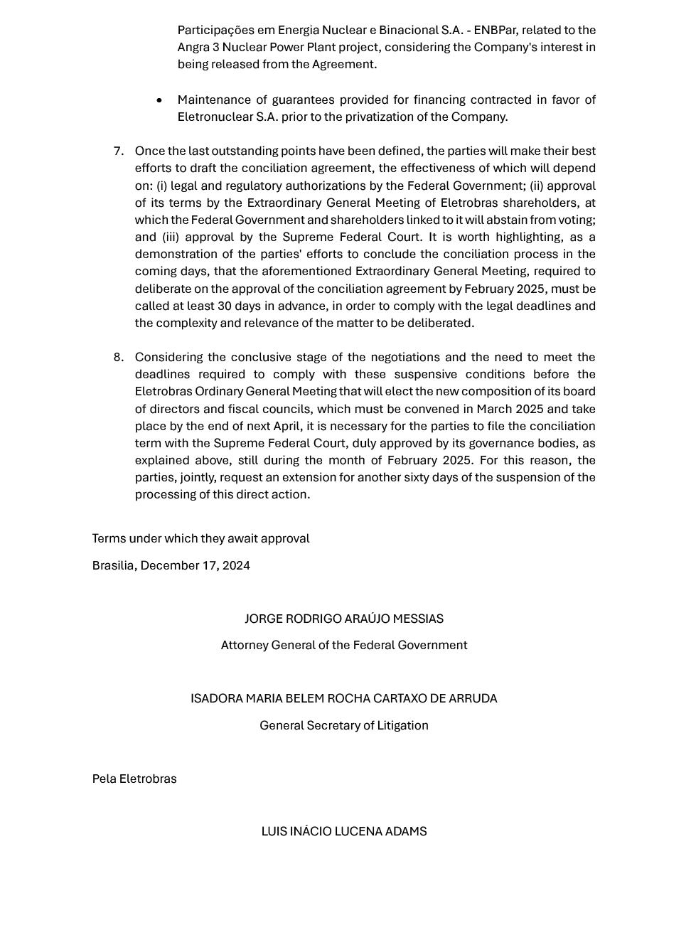 Participações em Energia Nuclear e Binacional S.A. - ENBPar, related to the Angra 3 Nuclear Power Plant project, considering the Company's interest in being released from the Agreement. • Maintenance of guarantees provided for financing contracted in favor of Eletronuclear S.A. prior to the privatization of the Company. 7. Once the last outstanding points have been defined, the parties will make their best efforts to draft the conciliation agreement, the effectiveness of which will depend on: (i) legal and regulatory authorizations by the Federal Government; (ii) approval of its terms by the Extraordinary General Meeting of Eletrobras shareholders, at which the Federal Government and shareholders linked to it will abstain from voting; and (iii) approval by the Supreme Federal Court. It is worth highlighting, as a demonstration of the parties' efforts to conclude the conciliation process in the coming days, that the aforementioned Extraordinary General Meeting, required to deliberate on the approval of the conciliation agreement by February 2025, must be called at least 30 days in advance, in order to comply with the legal deadlines and the complexity and relevance of the matter to be deliberated. 8. Considering the conclusive stage of the negotiations and the need to meet the deadlines required to comply with these suspensive conditions before the Eletrobras Ordinary General Meeting that will elect the new composition of its board of directors and fiscal councils, which must be convened in March 2025 and take place by the end of next April, it is necessary for the parties to file the conciliation term with the Supreme Federal Court, duly approved by its governance bodies, as explained above, still during the month of February 2025. For this reason, the parties, jointly, request an extension for another sixty days of the suspension of the processing of this direct action. Terms under which they await approval Brasilia, December 17, 2024 JORGE RODRIGO ARAÚJO MESSIAS Attorney General of the Federal Government ISADORA MARIA BELEM ROCHA CARTAXO DE ARRUDA General Secretary of Litigation Pela Eletrobras LUIS INÁCIO LUCENA ADAMS
