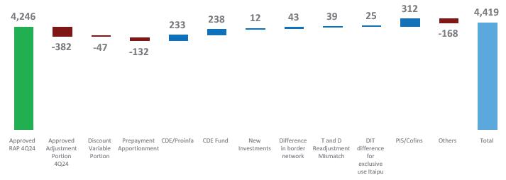 [1] The difference from the reported number in 3Q24 relates to the R$ 758 million regulatory remeasurement adjustment in the holding company. Although the remeasurement was recognized in the 3Q24, the corresponding deferred tax expense was accounted for in 4Q24.