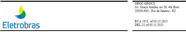 It is hereby certified, for all due purposes, that the 1051st meeting of the Board of Directors of Centrais Elétricas Brasileiras S.A. – Eletrobras ("Company" or "Eletrobras") was held at 2:00 p.m. on 03.13.2025, as called by the Chairman of the Board of Directors, pursuant to article 25, §4, of the Company's Articles of Incorporation. The meeting took place at Avenida Graça Aranha, 26, 20º andar, Centro, Rio de Janeiro – RJ. Chairman VICENTE FALCONI CAMPOS (VFC) took over the chairmanship of the meeting. Also participating were Directors FELIPE VILLELA DIAS (FVD), ANA SILVIA CORSO MATTE (ASM), IVAN DE SOUZA MONTEIRO (ISM), MARCELO DE SIQUEIRA FREITAS (MSF), DANIEL ALVES FERREIRA (DAF), MARISETE FÁTIMA DADALD PEREIRA (MFP), PEDRO BATISTA DE LIMA FILHO (PBL) and MARCELO GASPARINO DA SILVA (MGS). There was no record of absence. The council was secretariat by the Governance Secretary FERNANDO KHOURY FRANCISCO JUNIOR (FKJ), with the participation of the Governance Officer BRUNO KLAPPER LOPES (BKL). INSTRUCTIONS: The supporting material was made available to the Directors through the Governance Portal. QUORUM TO OPEN THE MEETING AND TO PASS RESOLUTIONS: The resolutions of the Board of Directors must take place in the presence of the majority of its members (Articles of incorporation, art. 25) and its resolutions must be taken, as a general rule, by the majority of those present, except in cases of a qualified quorum portrayed in art. 26 of the Articles of Incorporation. The meeting was held with the presence of nine members, in compliance with the minimum quorum of five members in order to open the meeting and with a minimum quorum of five members for passing resolutions, except in cases where there is an explicit record of changes in the quorum of those present at the time of the resolution. Prior declaration of conflict of interest on the part of a Director and/or their momentary absence from the Board entails their being subtracted for the purposes of calculating the respective minimum quorum for deliberation.