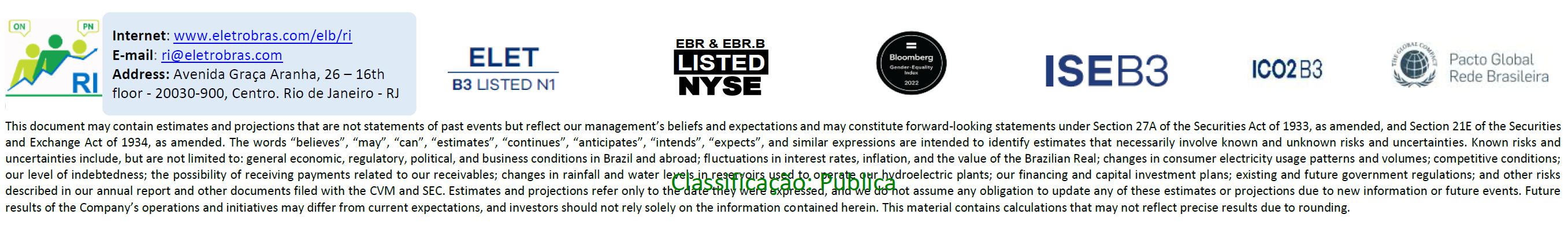 This document may contain estimates and projections that are not statements of past events but reflect our management’s beliefs and expectations and may constitute forward-looking statements under Section 27A of the Securities Act of 1933, as amended, and Section 21E of the Securities and Exchange Act of 1934, as amended. The words “believes”, “may”, “can”, “estimates”, “continues”, “anticipates”, “intends”, “expects”, and similar expressions are intended to identify estimates that necessarily involve known and unknown risks and uncertainties. Known risks and uncertainties include, but are not limited to: general economic, regulatory, political, and business conditions in Brazil and abroad; fluctuations in interest rates, inflation, and the value of the Brazilian Real; changes in consumer electricity usage patterns and volumes; competitive conditions; our level of indebtedness; the possibility of receiving payments related to our receivables; changes in rainfall and water levels in reservoirs used to operate our hydroelectric plants; our financing and capital investment plans; existing and future government regulations; and other risks described in our annual report and other documents filed with the CVM and SEC. Estimates and projections refer only to the date they were expressed, and we do not assume any obligation to update any of these estimates or projections due to new information or future events. Future results of the Company’s operations and initiatives may differ from current expectations, and investors should not rely solely on the information contained herein. This material contains calculations that may not reflect precise results due to rounding.