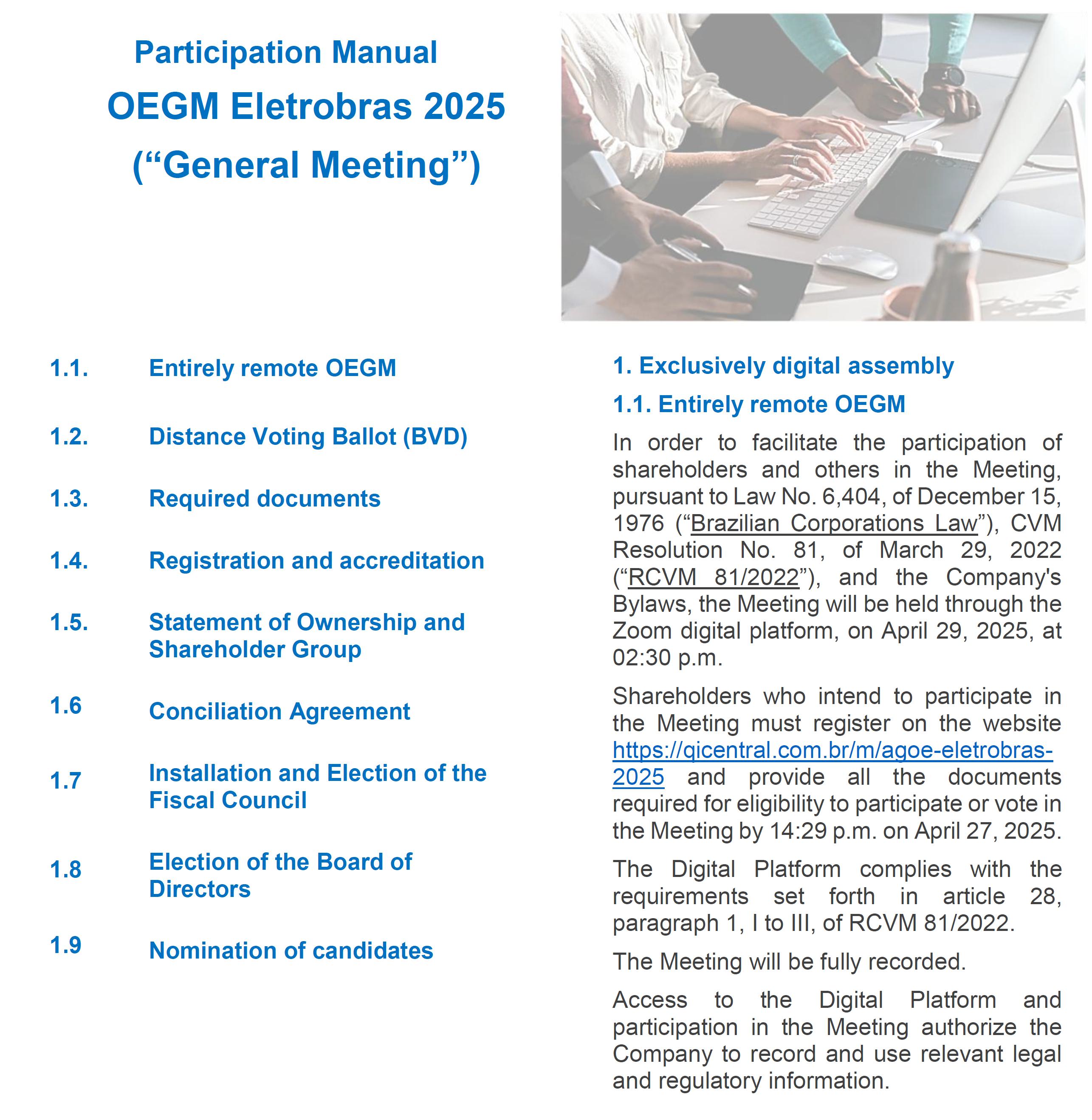 Shareholders may participate in the Meeting through BVD. Guidelines on the documentation required for remote voting are contained in the BVD, available on the websites: https://ri.eletrobras.com/, https://sistemas.cvm.gov.br/ and https://www.b3.com.br/pt_br/.