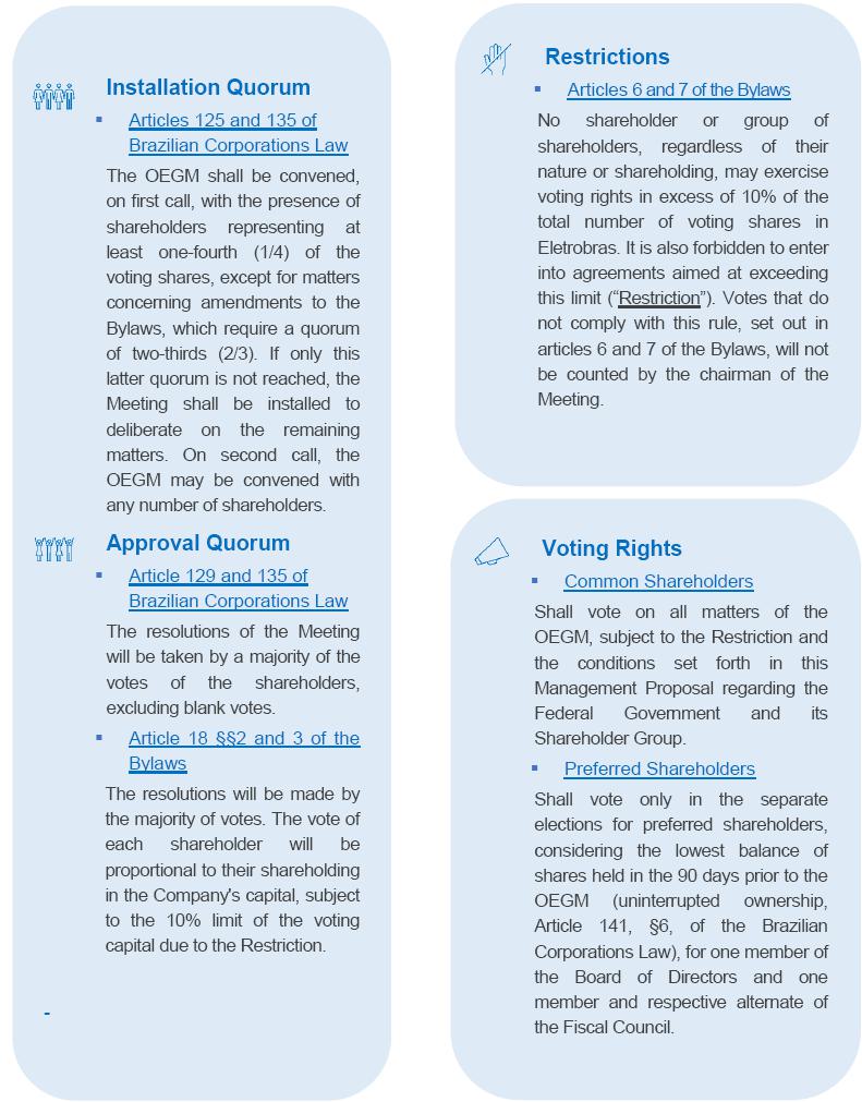 Article 20 - The Federal Government, on behalf of the shareholders that are part of its group of shareholders, pursuant to Article 8 of these Bylaws ("Federal Government Shareholders' Group"), considering the provisions of the Conciliation Agreement No. 07/2025/CCAF/CGU/AGU-GVDM, entered into within the scope of the Direct Action for the Declaration of Unconstitutionality No. 7,385 ("Conciliation Agreement"), the terms of which were approved at Eletrobras' extraordinary general meeting held on 29 April 2025 ("Conciliation Meeting"), shall have the right to elect, by means of a separate vote: