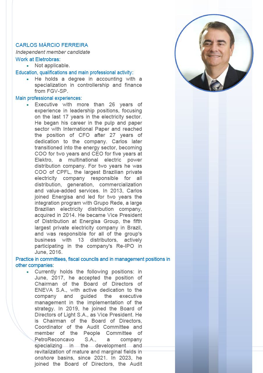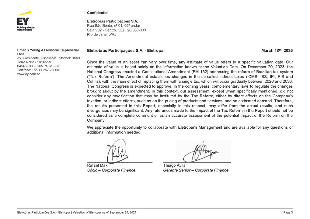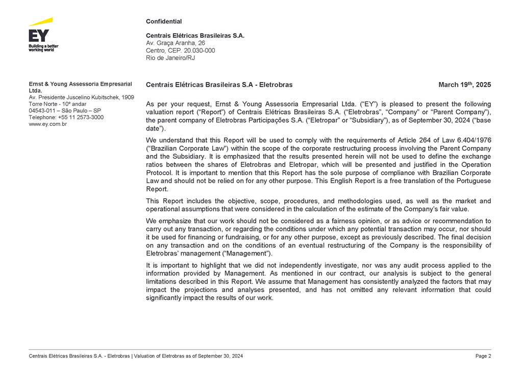It is with great honor and enthusiasm that, on behalf of the Board of Directors, I invite you to attend the Extraordinary General Meeting for Conciliation (“Conciliation EGM”) and the Ordinary and Extraordinary General Meetings (“OEGM”) of Centrais Elétricas Brasileiras S.A. (“Eletrobras” or the “Company”), to be held on April 29, 2025, at 1:00 p.m. and 2:30 p.m. (Brasília time), respectively, in an exclusively digital format. This is a significant milestone for all of us, and I would like to take this opportunity to share some reflections on the profound transformational journey we are undertaking and experiencing.
