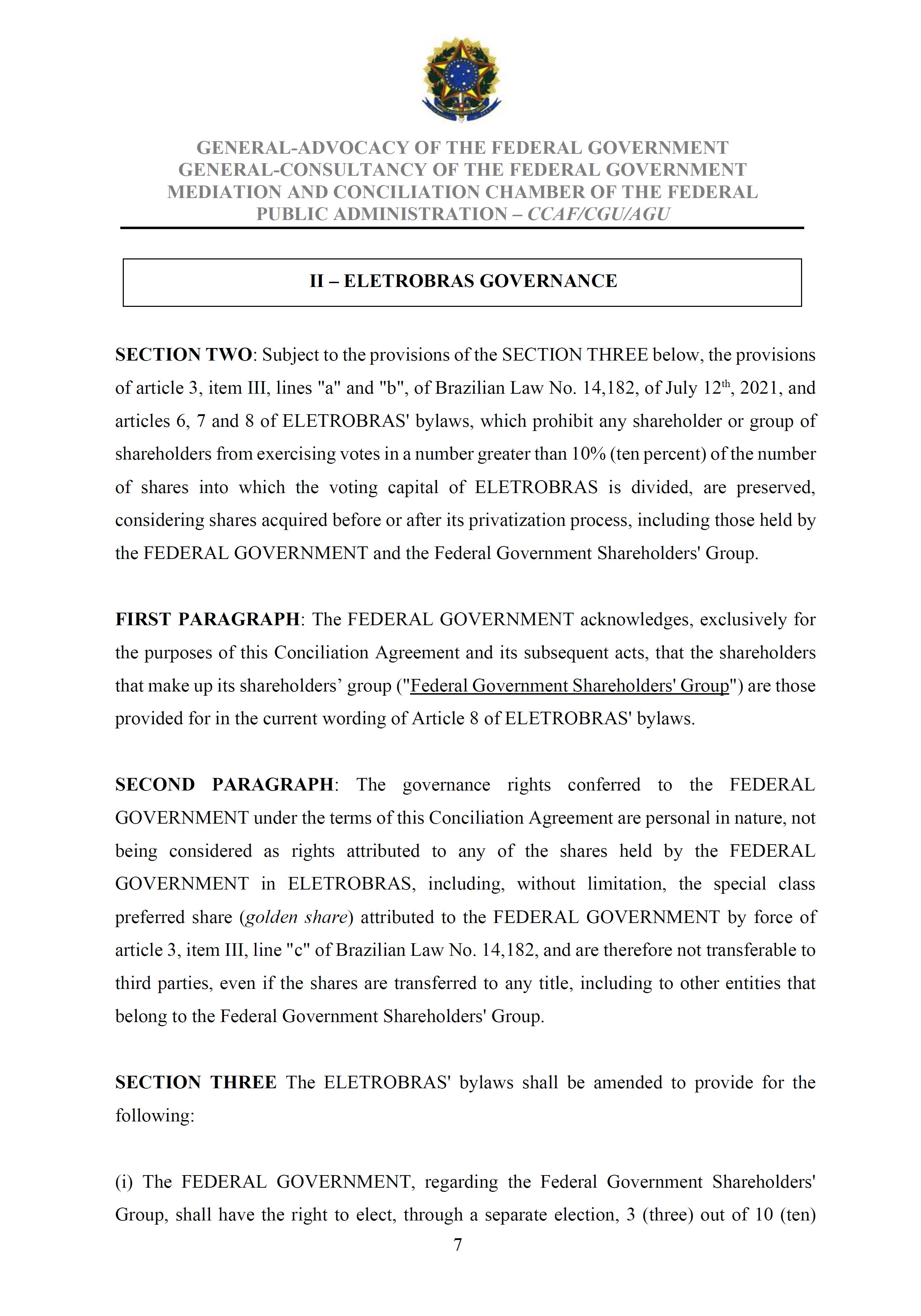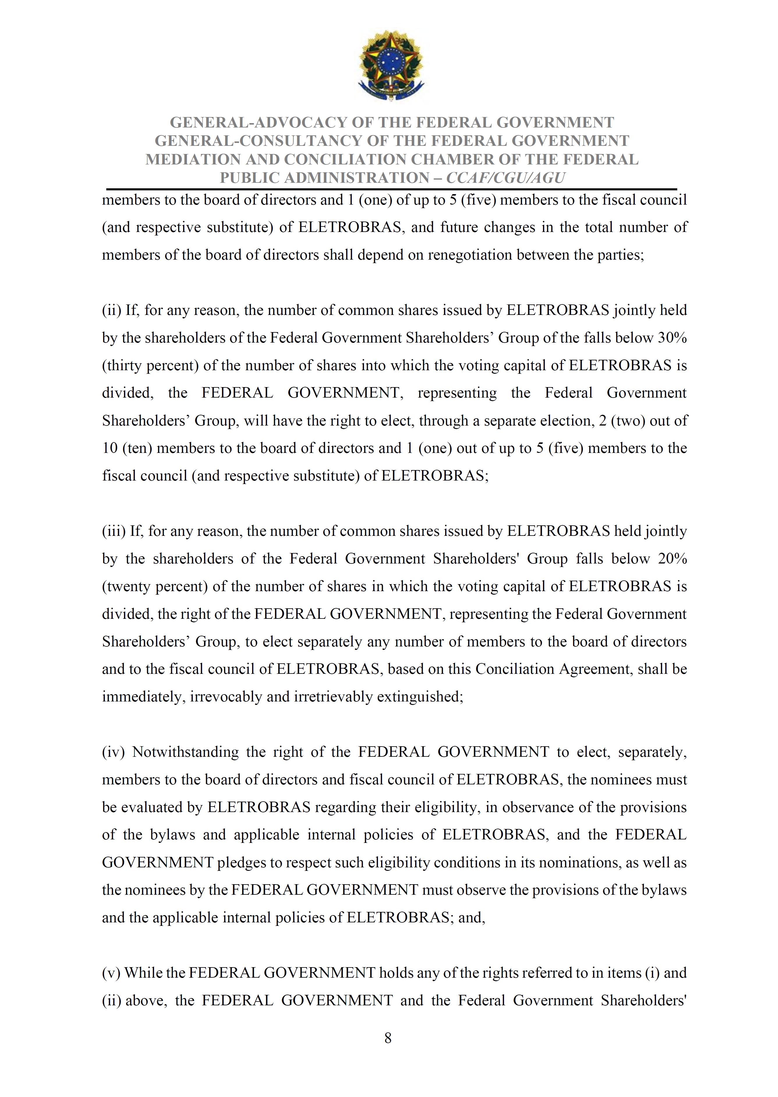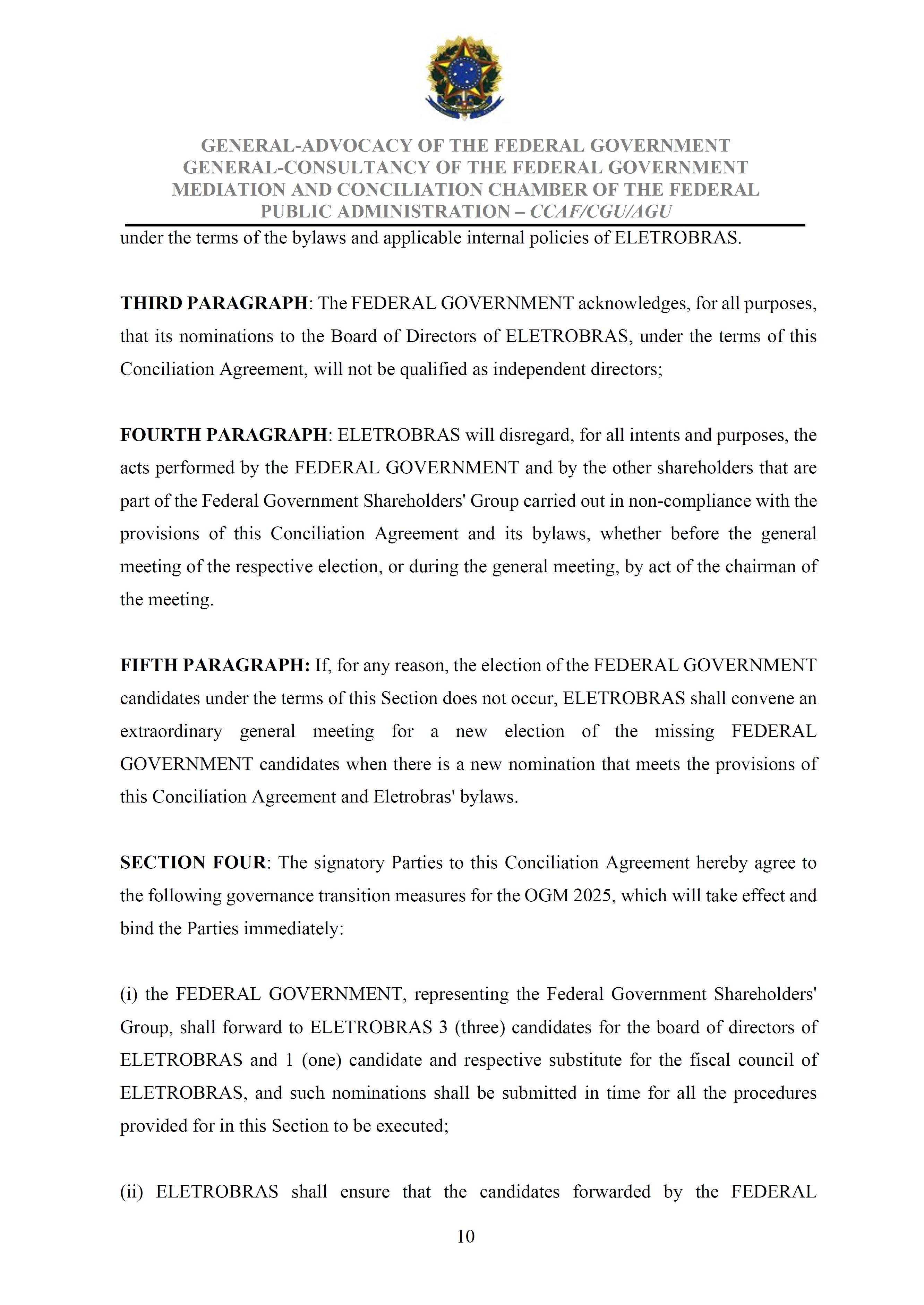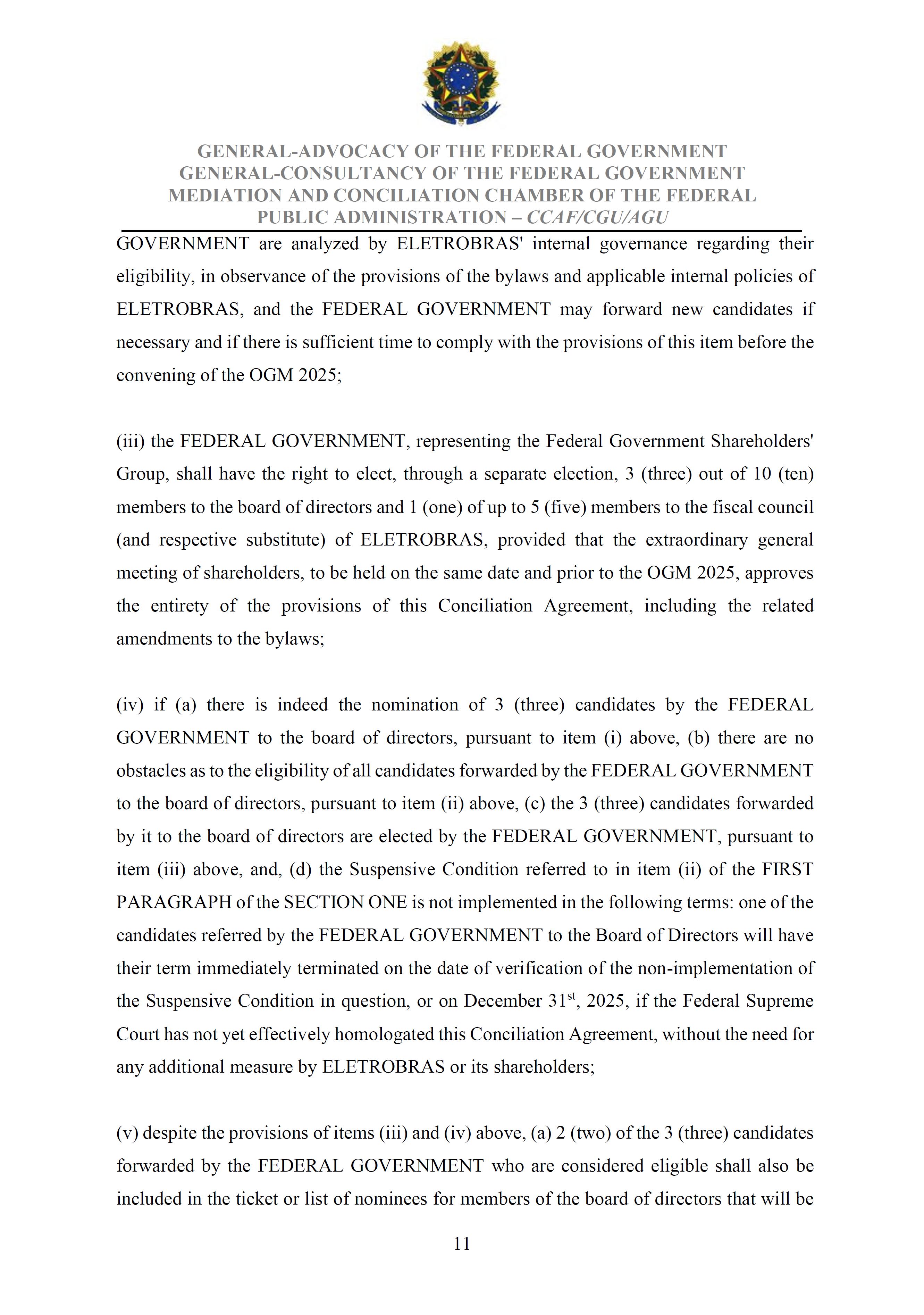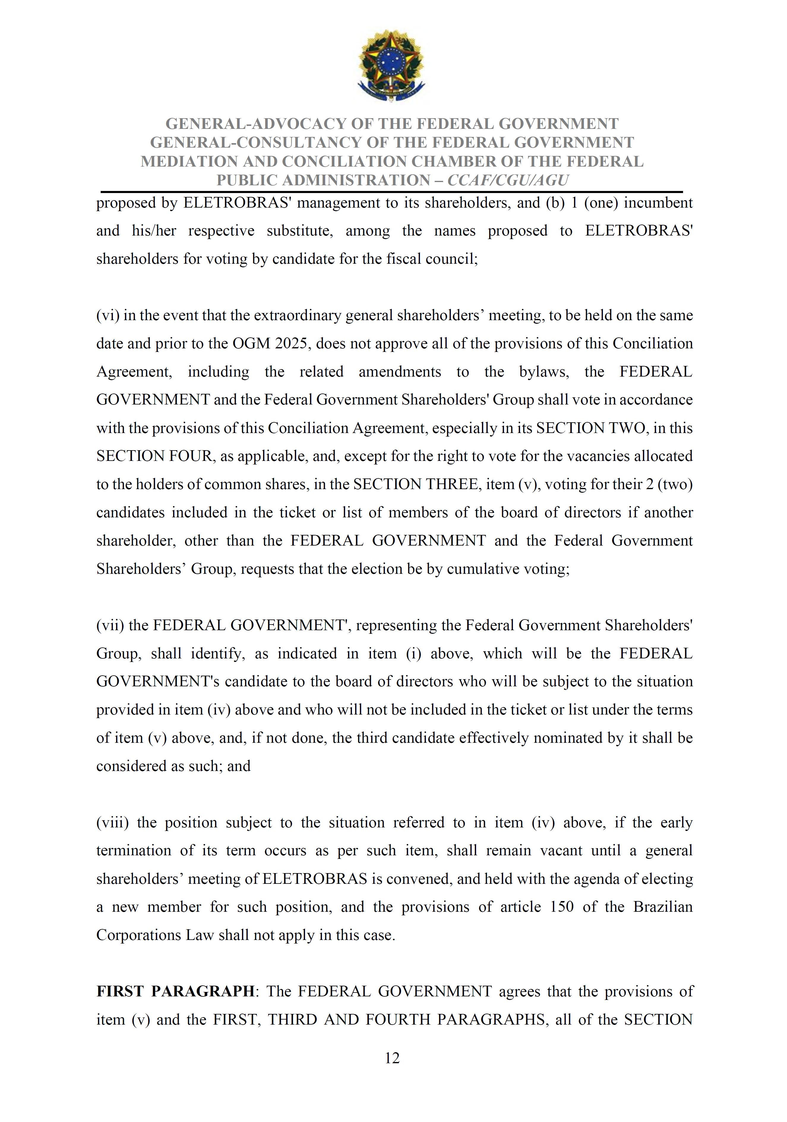 Sole Paragraph - If the conditions of effectiveness dealt with in the Conciliation Agreement related to its ratification by the Federal Supreme Court do not materialize, under the terms and conditions agreed therein, the position held by one of the three candidates elected separately by the Federal Government will immediately become vacant, as previously defined in the management proposal of the Ordinary General Meeting held during the fiscal year of 2025, and it will be up to the Board of Directors to call a general meeting only for the election of his replacement.