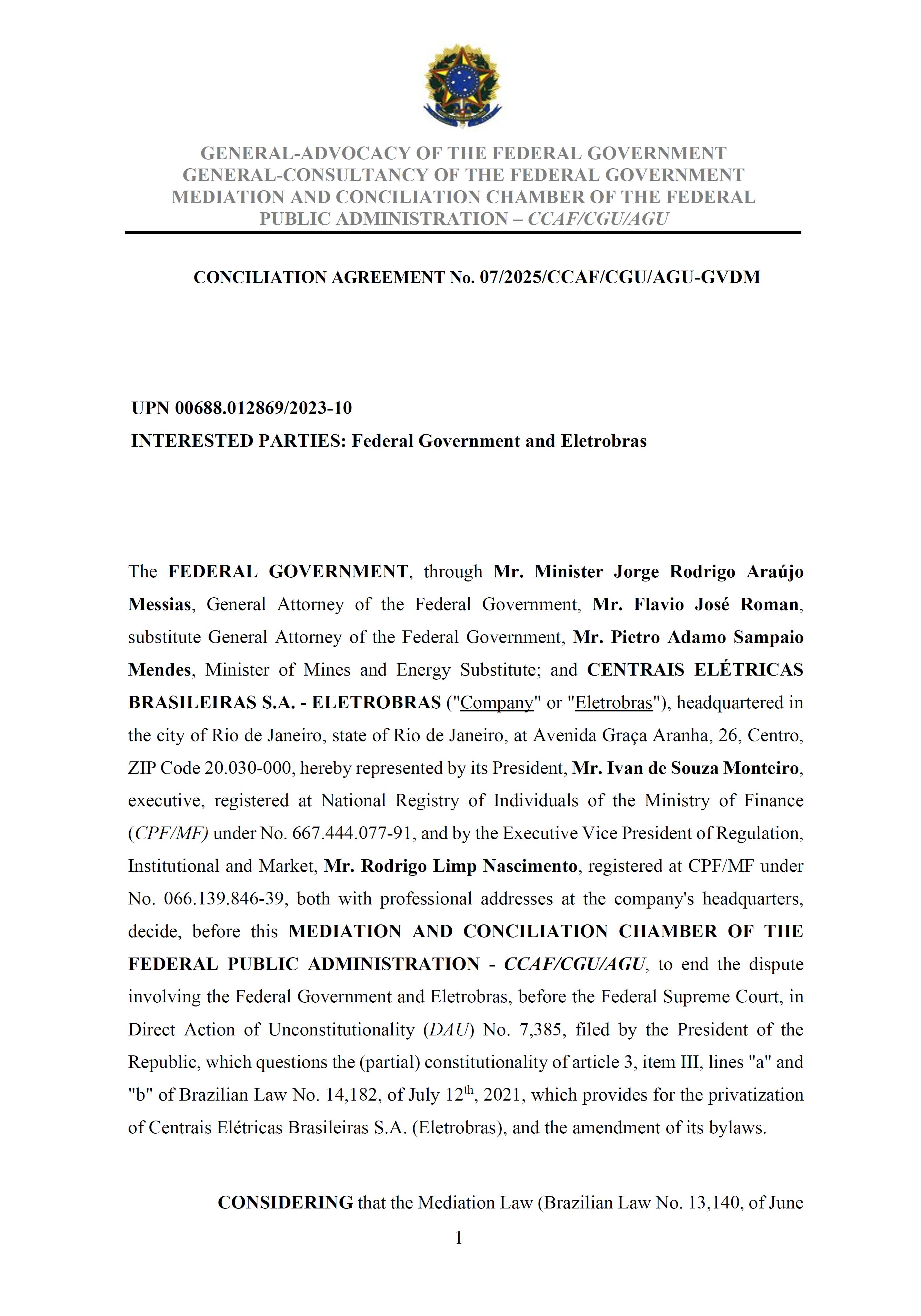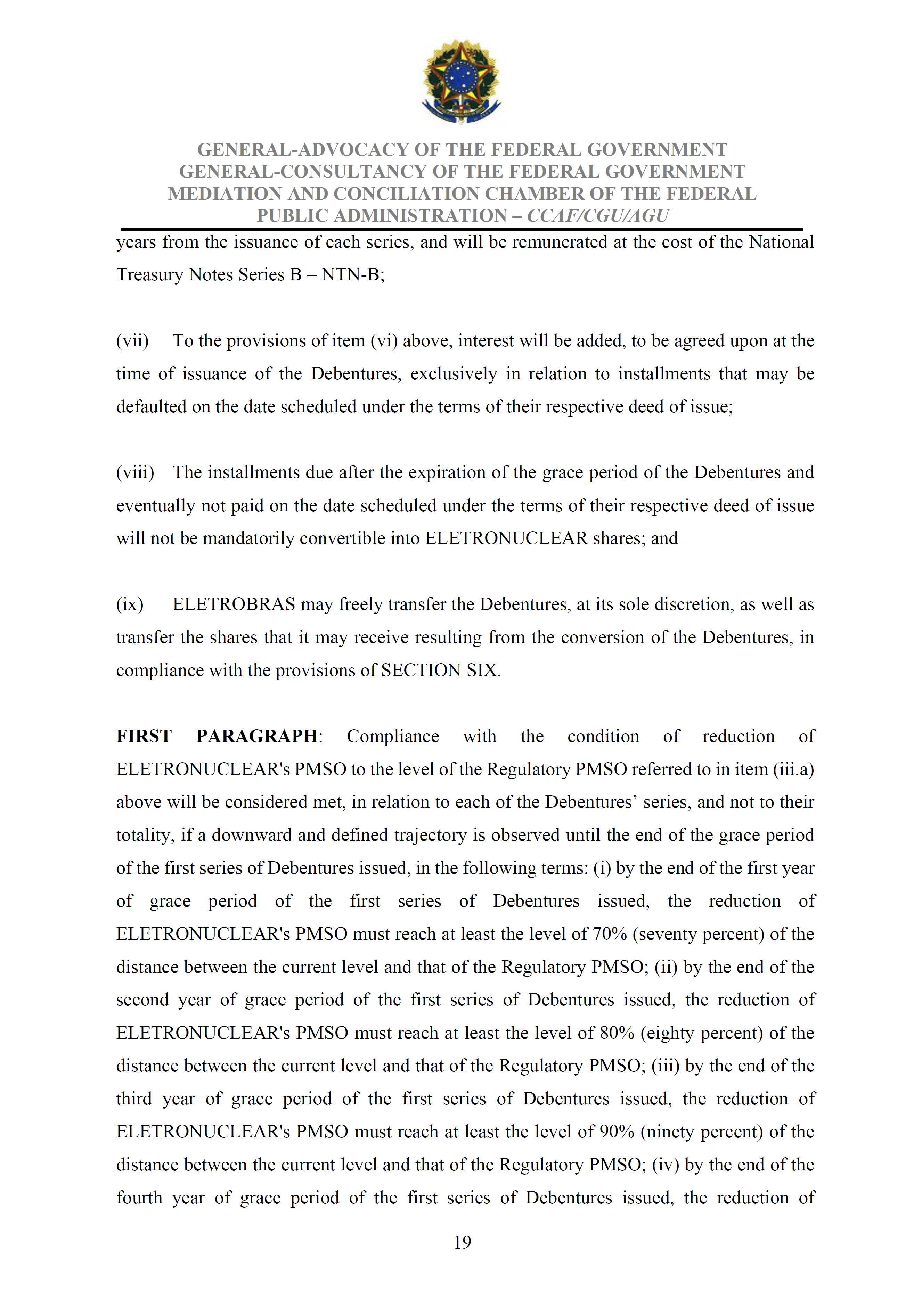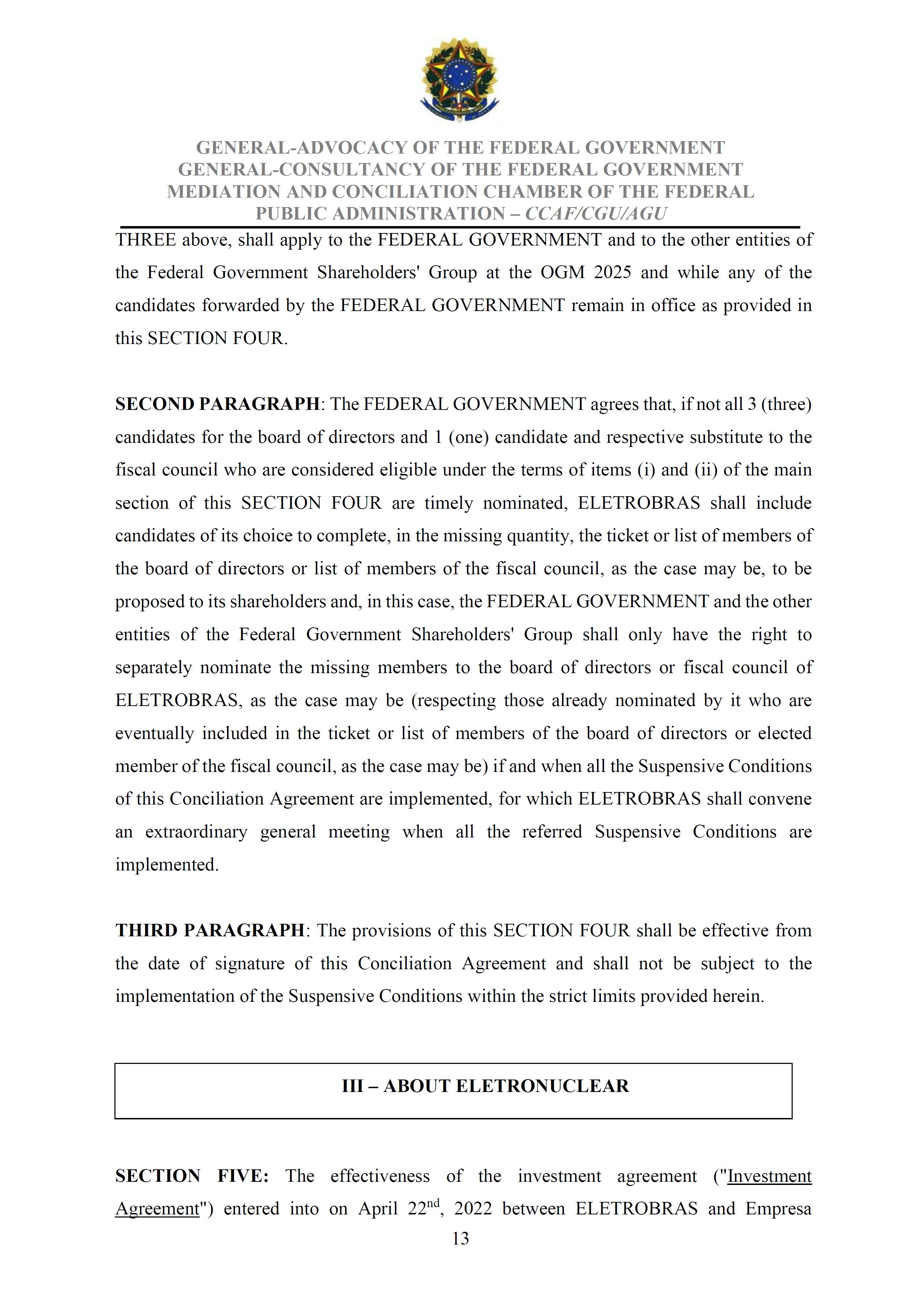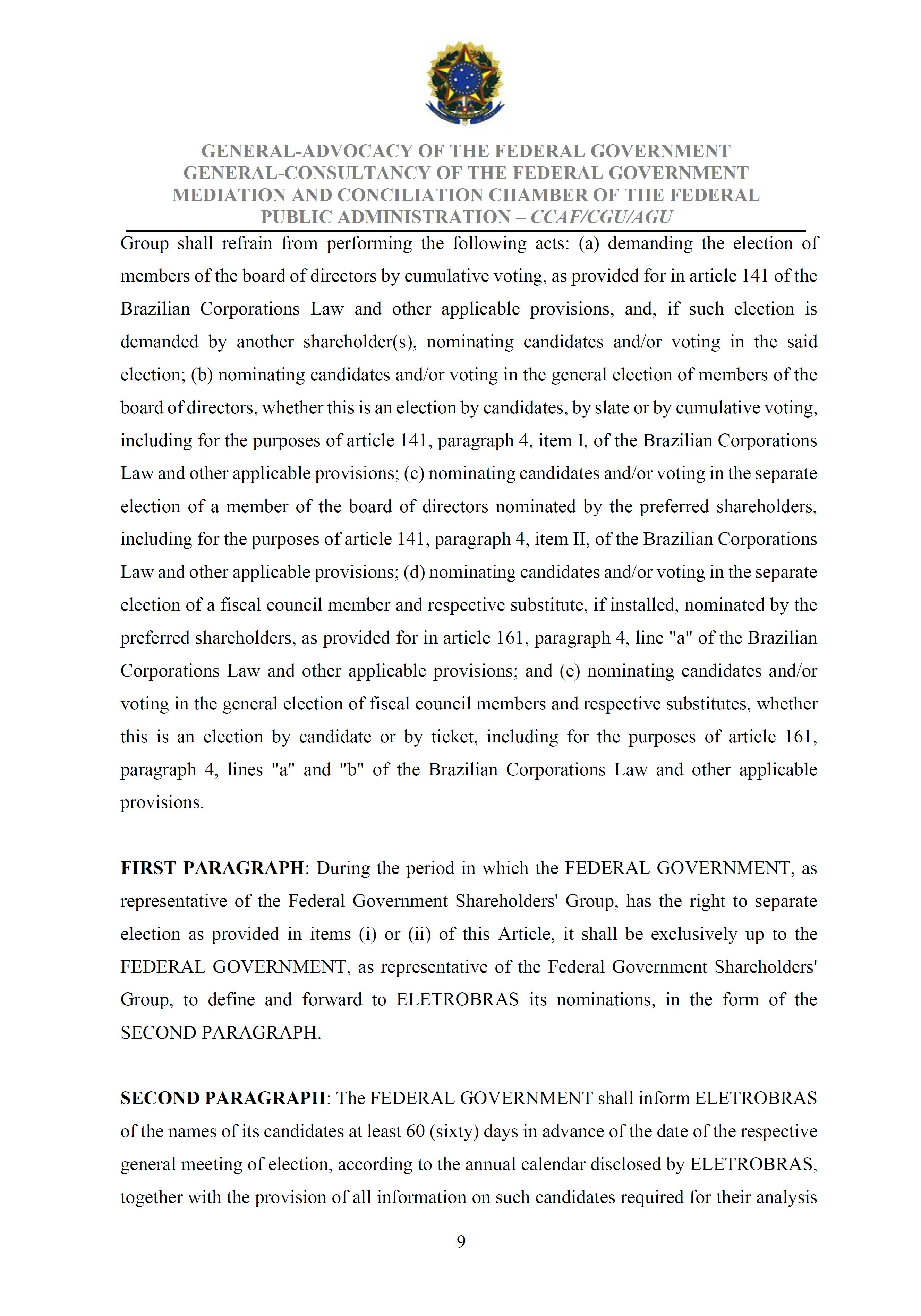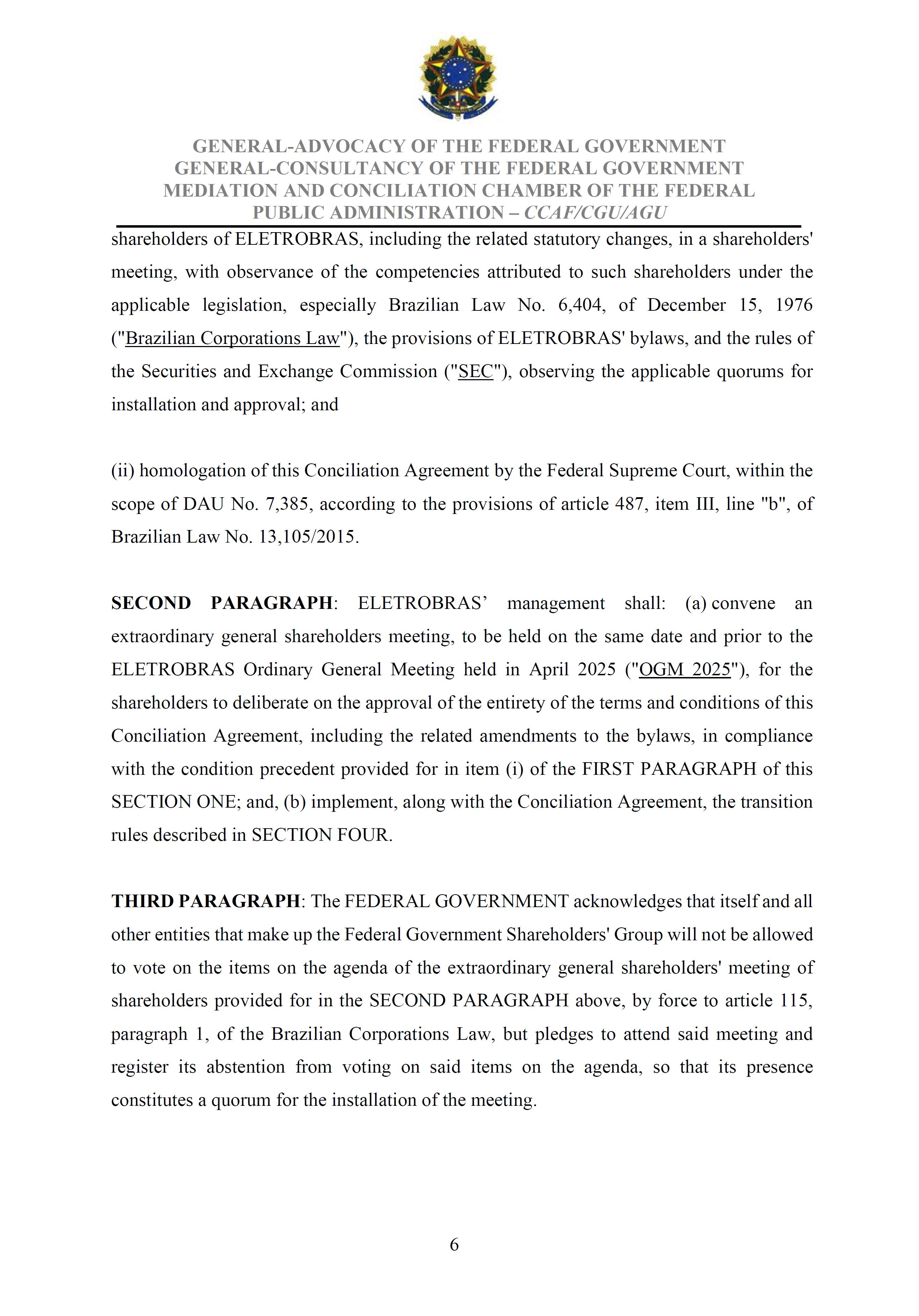 Sole Paragraph - If the conditions of effectiveness dealt with in the Conciliation Agreement related to its ratification by the Federal Supreme Court do not materialize, under the terms and conditions agreed therein, the position held by one of the three candidates elected separately by the Federal Government will immediately become vacant, as previously defined in the management proposal of the Ordinary General Meeting held during the fiscal year of 2025, and it will be up to the Board of Directors to call a general meeting only for the election of his replacement.