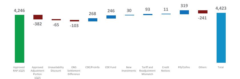(-) R$ 483 million YoY reduction in Annual Permitted Revenue (RAP) related to the 2024 Periodic Tariff Review (2024 RTP), of which R$ 328 million related to Postponement Adjustment Portion (PA Postergação).