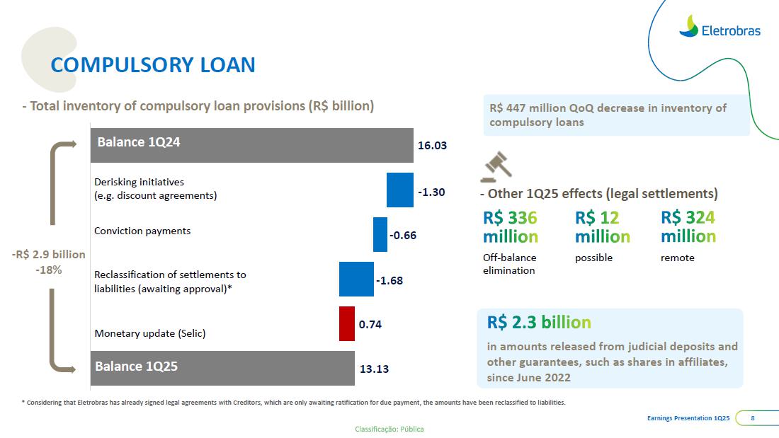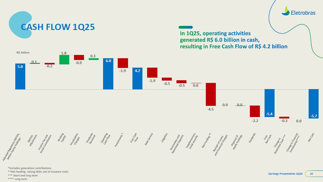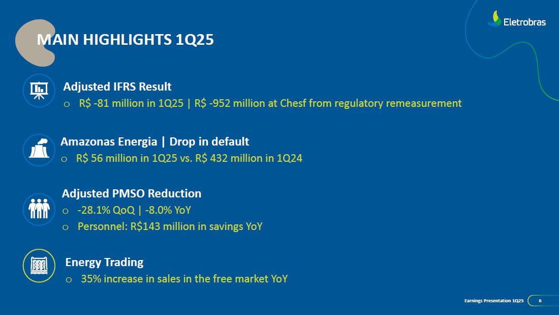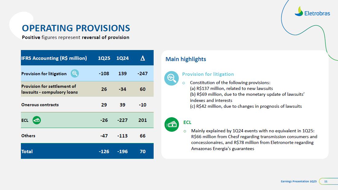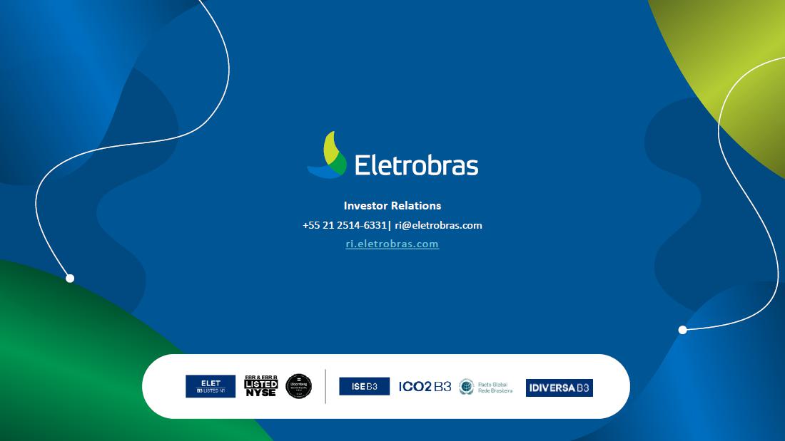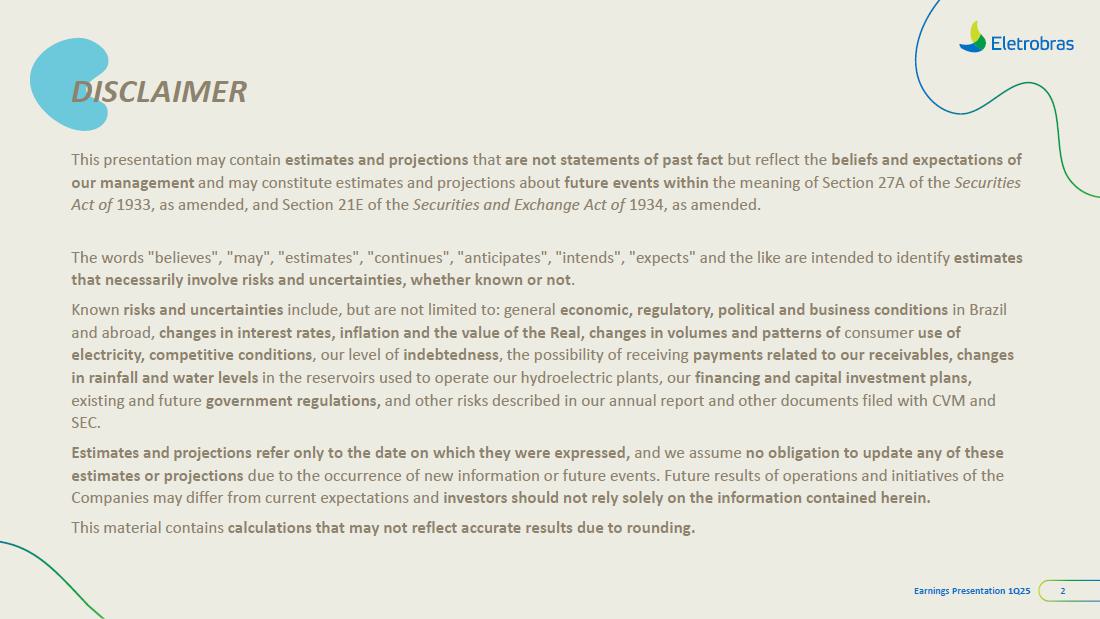 This document may contain estimates and projections that are not statements of past events but reflect our management’s beliefs and expectations and may constitute forward-looking statements under Section 27A of the Securities Act of 1933, as amended, and Section 21E of the Securities and Exchange Act of 1934, as amended. The words “believes”, “may”, “can”, “estimates”, “continues”, “anticipates”, “intends”, “expects”, and similar expressions are intended to identify estimates that necessarily involve known and unknown risks and uncertainties. Known risks and uncertainties include, but are not limited to: general economic, regulatory, political, and business conditions in Brazil and abroad; fluctuations in interest rates, inflation, and the value of the Brazilian Real; changes in consumer electricity usage patterns and volumes; competitive conditions; our level of indebtedness; the possibility of receiving payments related to our receivables; changes in rainfall and water levels in reservoirs used to operate our hydroelectric plants; our financing and capital investment plans; existing and future government regulations; and other risks described in our annual report and other documents filed with the CVM and SEC. Estimates and projections refer only to the date they were expressed, and we do not assume any obligation to update any of these estimates or projections due to new information or future events. Future results of the Company’s operations and initiatives may differ from current expectations, and investors should not rely solely on the information contained herein. This material contains calculations that may not reflect precise results due to rounding.