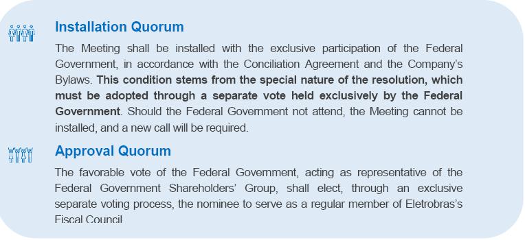 This Extraordinary General Meeting ("Meeting") will be held solely for the election of the regular member of the Fiscal Council of Eletrobras appointed and to be elected exclusively by the Federal Government, pursuant to Conciliation Agreement No. 07/2025/CCAF/CGU/AGU-GVDM, entered into on March 25, 2025, between the Federal Government and the Company and approved by the shareholders at the Extraordinary General Meeting, held on April 29, 2025 ("Conciliation Agreement").