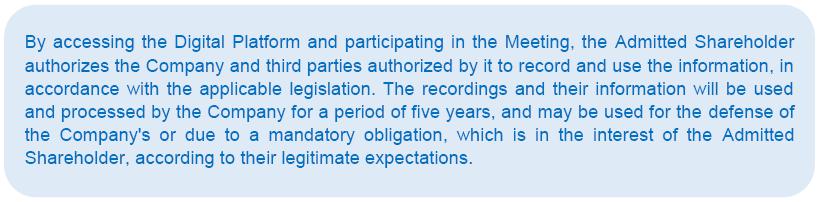 It is important to note that, despite the restriction on voting rights, all of the Company's shareholders will be able to participate in the Meeting, following the debates and deliberations through the Digital Platform (defined below) made available for the event, in order to ensure transparency and access to information.