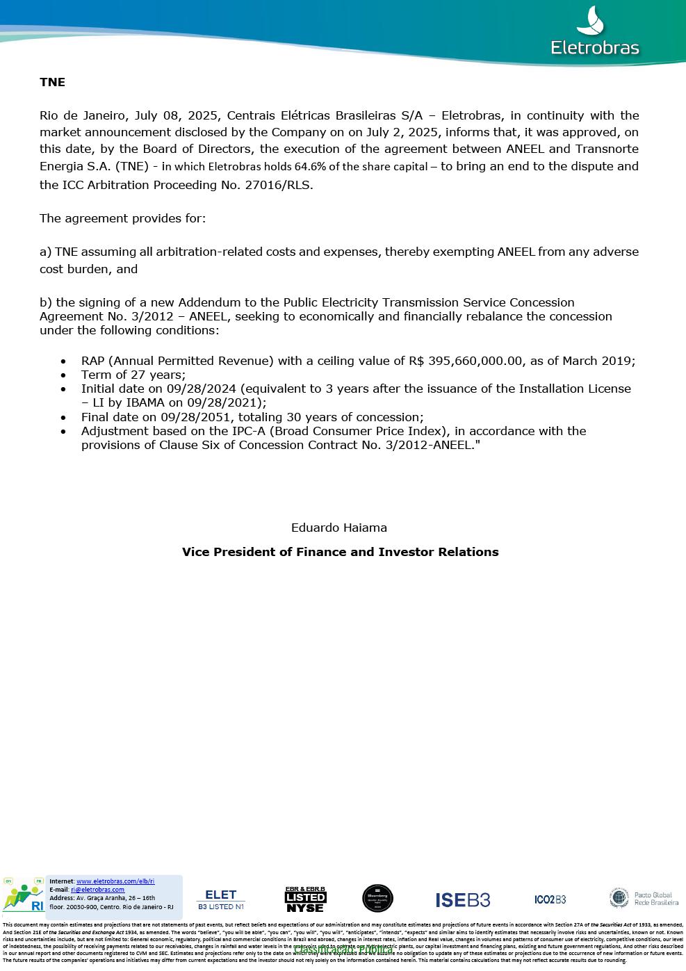 TNE Rio de Janeiro, July 08, 2025, Centrais Elétricas Brasileiras S/A – Eletrobras, in continuity with the market announcement disclosed by the Company on on July 2, 2025, informs that, it was approved, on this date, by the Board of Directors, the execution of the agreement between ANEEL and Transnorte Energia S.A. (TNE) - in which Eletrobras holds 64.6% of the share capital – to bring an end to the dispute and the ICC Arbitration Proceeding No. 27016/RLS. The agreement provides for: a) TNE assuming all arbitration-related costs and expenses, thereby exempting ANEEL from any adverse cost burden, and b) the signing of a new Addendum to the Public Electricity Transmission Service Concession Agreement No. 3/2012 – ANEEL, seeking to economically and financially rebalance the concession under the following conditions:RAP (Annual Permitted Revenue) with a ceiling value of R$ 395,660,000.00, as of March 2019;Term of 27 years;Initial date on 09/28/2024 (equivalent to 3 years after the issuance of the Installation License – LI by IBAMA on 09/28/2021);Final date on 09/28/2051, totaling 30 years of concession;Adjustment based on the IPC-A (Broad Consumer Price Index), in accordance with the provisions of Clause Six of Concession Contract No. 3/2012-ANEEL." Eduardo Haiama Vice President of Finance and Investor Relations