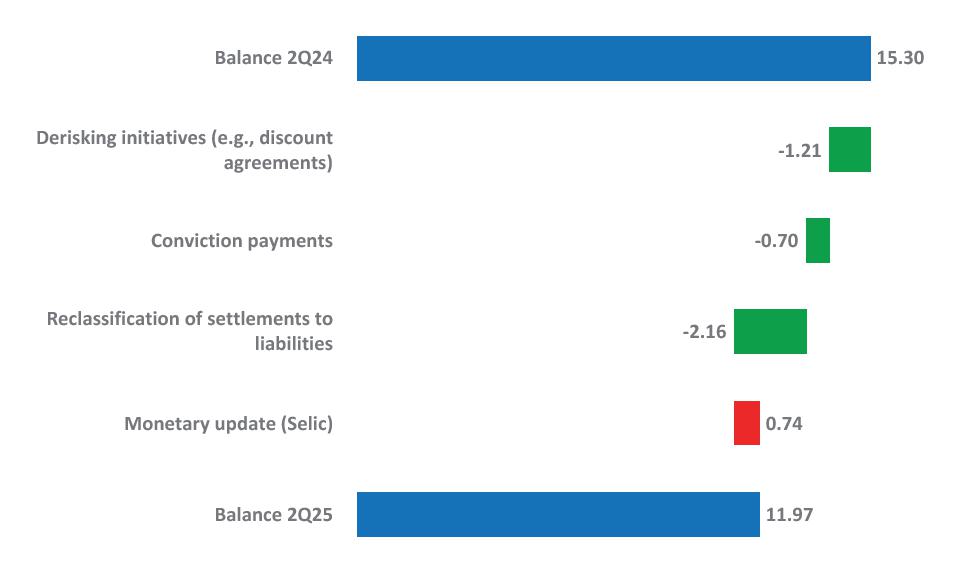 Compulsory Loan: the inventory of provisions was reduced by R$ 1.2 billion compared to 1Q25 and by R$ 3.3 billion compared to 2Q24, totaling R$ 12 billion in 2Q25. A net reversal of R$ 279 million was recorded in the quarter, related to favorable decisions and agreements signed.