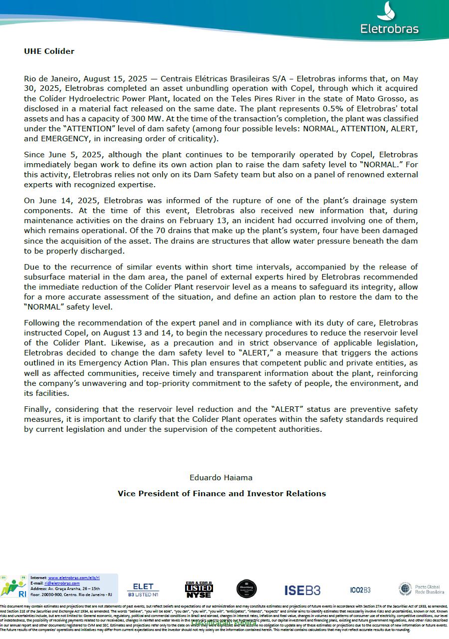 LISTED NYSE EBR & EBR.B Internet: www.eletrobras.com/elb/ri E-mail: ri@eletrobras.com Address: Av. Graça Aranha, 26 – 15th floor. 20030-900, Centro. Rio de Janeiro - RJ This document may contain estimates and projections that are not statements of past events, but reflect beliefs and expectations of our administration and may constitute estimates and projections of future events in accordance with Section 27A of the Securities Act of 1933, as amended, And Section 21E of the Securities and Exchange Act 1934, as amended. The words “believe”, “you will be able”, “you can”, “you will”, “you will”, “anticipates”, “intends”, “expects” and similar aims to identify estimates that necessarily involve risks and uncertainties, known or not. Known risks and uncertainties include, but are not limited to: General economic, regulatory, political and commercial conditions in Brazil and abroad, changes in interest rates, inflation and Real value, changes in volumes and patterns of consumer use of electricity, competitive conditions, our level of indebtedness, the possibility of receiving payments related to our receivables, changes in rainfall and water levels in the reservoirs used to operate our hydroelectric plants, our capital investment and financing plans, existing and future government regulations, And other risks described in our annual report and other documents registered to CVM and SEC. Estimates and projections refer only to the date on which they were expressed and we assume no obligation to update any of these estimates or projections due to the occurrence of new information or future events. The future results of the companies' operations and initiatives may differ from current expectations and the investor should not rely solely on the information contained herein. This material contains calculations that may not reflect accurate results due to rounding. Classificação: Pública UHE Colíder Rio de Janeiro, August 15, 2025 — Centrais Elétricas Brasileiras S/A – Eletrobras informs that, on May 30, 2025, Eletrobras completed an asset unbundling operation with Copel, through which it acquired the Colíder Hydroelectric Power Plant, located on the Teles Pires River in the state of Mato Grosso, as disclosed in a material fact released on the same date. The plant represents 0.5% of Eletrobras' total assets and has a capacity of 300 MW. At the time of the transaction’s completion, the plant was classified under the “ATTENTION” level of dam safety (among four possible levels: NORMAL, ATTENTION, ALERT, and EMERGENCY, in increasing order of criticality). Since June 5, 2025, although the plant continues to be temporarily operated by Copel, Eletrobras immediately began work to define its own action plan to raise the dam safety level to “NORMAL.” For this activity, Eletrobras relies not only on its Dam Safety team but also on a panel of renowned external experts with recognized expertise. On June 14, 2025, Eletrobras was informed of the rupture of one of the plant’s drainage system components. At the time of this event, Eletrobras also received new information that, during maintenance activities on the drains on February 13, an incident had occurred involving one of them, which remains operational. Of the 70 drains that make up the plant’s system, four have been damaged since the acquisition of the asset. The drains are structures that allow water pressure beneath the dam to be properly discharged. Due to the recurrence of similar events within short time intervals, accompanied by the release of subsurface material in the dam area, the panel of external experts hired by Eletrobras recommended the immediate reduction of the Colíder Plant reservoir level as a means to safeguard its integrity, allow for a more accurate assessment of the situation, and define an action plan to restore the dam to the “NORMAL” safety level. Following the recommendation of the expert panel and in compliance with its duty of care, Eletrobras instructed Copel, on August 13 and 14, to begin the necessary procedures to reduce the reservoir level of the Colíder Plant. Likewise, as a precaution and in strict observance of applicable legislation, Eletrobras decided to change the dam safety level to “ALERT,” a measure that triggers the actions outlined in its Emergency Action Plan. This plan ensures that competent public and private entities, as well as affected communities, receive timely and transparent information about the plant, reinforcing the company’s unwavering and top-priority commitment to the safety of people, the environment, and its facilities. Finally, considering that the reservoir level reduction and the “ALERT” status are preventive safety measures, it is important to clarify that the Colíder Plant operates within the safety standards required by current legislation and under the supervision of the competent authorities. Eduardo Haiama Vice President of Finance and Investor Relations