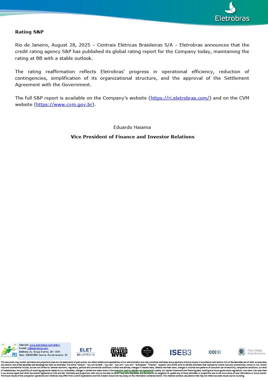 LISTED NYSE EBR & EBR.B Internet: www.eletrobras.com/elb/ri E-mail: ri@eletrobras.com Address: Av. Graça Aranha, 26 – 15th floor. 20030-900, Centro. Rio de Janeiro - RJ This document may contain estimates and projections that are not statements of past events, but reflect beliefs and expectations of our administration and may constitute estimates and projections of future events in accordance with Section 27A of the Securities Act of 1933, as amended, And Section 21E of the Securities and Exchange Act 1934, as amended. The words “believe”, “you will be able”, “you can”, “you will”, “you will”, “anticipates”, “intends”, “expects” and similar aims to identify estimates that necessarily involve risks and uncertainties, known or not. Known risks and uncertainties include, but are not limited to: General economic, regulatory, political and commercial conditions in Brazil and abroad, changes in interest rates, inflation and Real value, changes in volumes and patterns of consumer use of electricity, competitive conditions, our level of indebtedness, the possibility of receiving payments related to our receivables, changes in rainfall and water levels in the reservoirs used to operate our hydroelectric plants, our capital investment and financing plans, existing and future government regulations, And other risks described in our annual report and other documents registered to CVM and SEC. Estimates and projections refer only to the date on which they were expressed and we assume no obligation to update any of these estimates or projections due to the occurrence of new information or future events. The future results of the companies' operations and initiatives may differ from current expectations and the investor should not rely solely on the information contained herein. This material contains calculations that may not reflect accurate results due to rounding. Classificação: Pública Rating S&P Rio de Janeiro, August 28, 2025 – Centrais Elétricas Brasileiras S/A – Eletrobras announces that the credit rating agency S&P has published its global rating report for the Company today, maintaining the rating at BB with a stable outlook. The rating reaffirmation reflects Eletrobras' progress in operational efficiency, reduction of contingencies, simplification of its organizational structure, and the approval of the Settlement Agreement with the Government. The full S&P report is available on the Company’s website (https://ri.eletrobras.com/) and on the CVM website (https://www.cvm.gov.br). Eduardo Haiama Vice President of Finance and Investor Relations