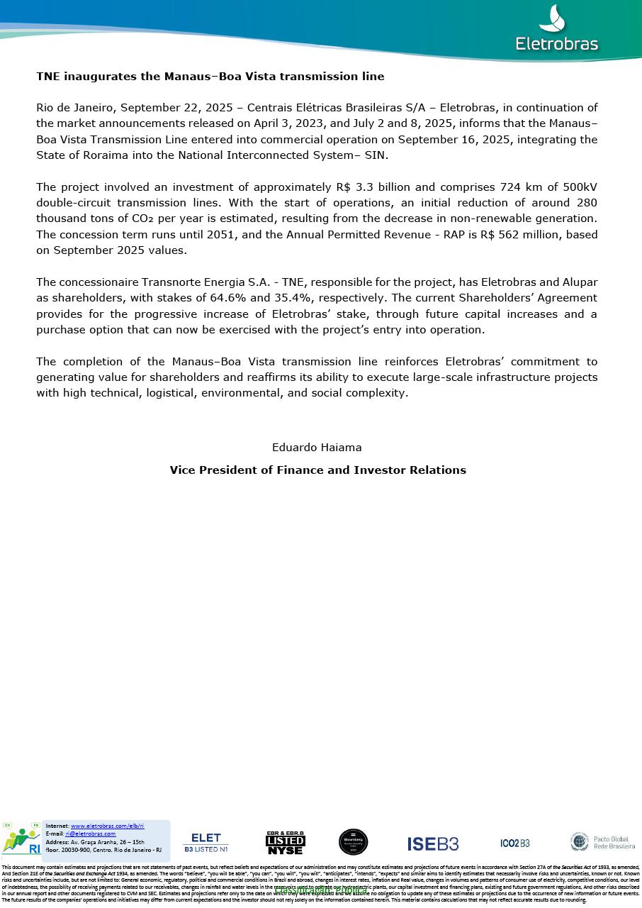 LISTED NYSE EBR & EBR.B Internet: www.eletrobras.com/elb/ri E-mail: ri@eletrobras.com Address: Av. Graça Aranha, 26 – 15th floor. 20030-900, Centro. Rio de Janeiro - RJ This document may contain estimates and projections that are not statements of past events, but reflect beliefs and expectations of our administration and may constitute estimates and projections of future events in accordance with Section 27A of the Securities Act of 1933, as amended, And Section 21E of the Securities and Exchange Act 1934, as amended. The words “believe”, “you will be able”, “you can”, “you will”, “you will”, “anticipates”, “intends”, “expects” and similar aims to identify estimates that necessarily involve risks and uncertainties, known or not. Known risks and uncertainties include, but are not limited to: General economic, regulatory, political and commercial conditions in Brazil and abroad, changes in interest rates, inflation and Real value, changes in volumes and patterns of consumer use of electricity, competitive conditions, our level of indebtedness, the possibility of receiving payments related to our receivables, changes in rainfall and water levels in the reservoirs used to operate our hydroelectric plants, our capital investment and financing plans, existing and future government regulations, And other risks described in our annual report and other documents registered to CVM and SEC. Estimates and projections refer only to the date on which they were expressed and we assume no obligation to update any of these estimates or projections due to the occurrence of new information or future events. The future results of the companies' operations and initiatives may differ from current expectations and the investor should not rely solely on the information contained herein. This material contains calculations that may not reflect accurate results due to rounding. Classificação: Pública TNE inaugurates the Manaus–Boa Vista transmission line Rio de Janeiro, September 22, 2025 – Centrais Elétricas Brasileiras S/A – Eletrobras, in continuation of the market announcements released on April 3, 2023, and July 2 and 8, 2025, informs that the Manaus–Boa Vista Transmission Line entered into commercial operation on September 16, 2025, integrating the State of Roraima into the National Interconnected System– SIN. The project involved an investment of approximately R$ 3.3 billion and comprises 724 km of 500kV double-circuit transmission lines. With the start of operations, an initial reduction of around 280 thousand tons of CO₂ per year is estimated, resulting from the decrease in non-renewable generation. The concession term runs until 2051, and the Annual Permitted Revenue - RAP is R$ 562 million, based on September 2025 values. The concessionaire Transnorte Energia S.A. - TNE, responsible for the project, has Eletrobras and Alupar as shareholders, with stakes of 64.6% and 35.4%, respectively. The current Shareholders’ Agreement provides for the progressive increase of Eletrobras’ stake, through future capital increases and a purchase option that can now be exercised with the project’s entry into operation. The completion of the Manaus–Boa Vista transmission line reinforces Eletrobras’ commitment to generating value for shareholders and reaffirms its ability to execute large-scale infrastructure projects with high technical, logistical, environmental, and social complexity. Eduardo Haiama Vice President of Finance and Investor Relations