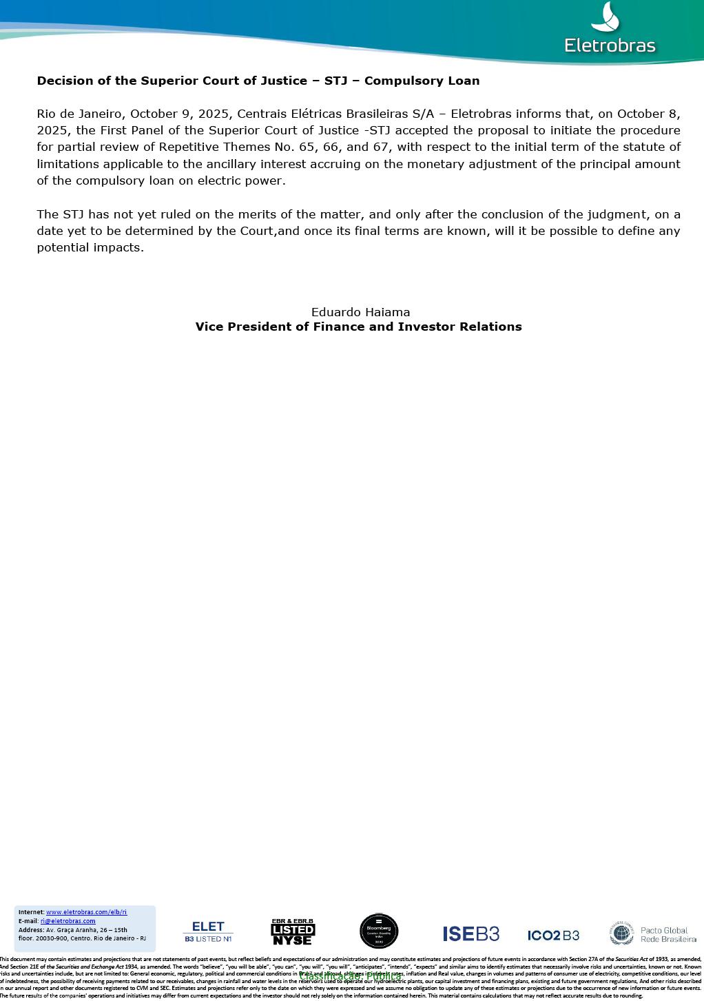 Decision of the Superior Court of Justice – STJ – Compulsory Loan Rio de Janeiro, October 9, 2025, Centrais Elétricas Brasileiras S/A – Eletrobras informs that, on October 8, 2025, the First Panel of the Superior Court of Justice -STJ accepted the proposal to initiate the procedure for partial review of Repetitive Themes No. 65, 66, and 67, with respect to the initial term of the statute of limitations applicable to the ancillary interest accruing on the monetary adjustment of the principal amount of the compulsory loan on electric power. The STJ has not yet ruled on the merits of the matter, and only after the conclusion of the judgment, on a date yet to be determined by the Court,and once its final terms are known, will it be possible to define any potential impacts. Eduardo Haiama Vice President of Finance and Investor Relations