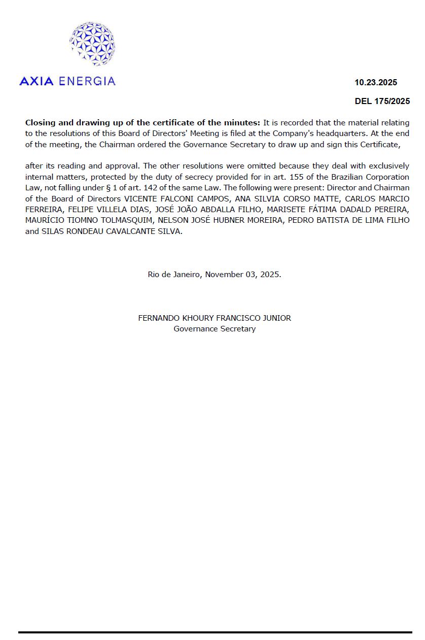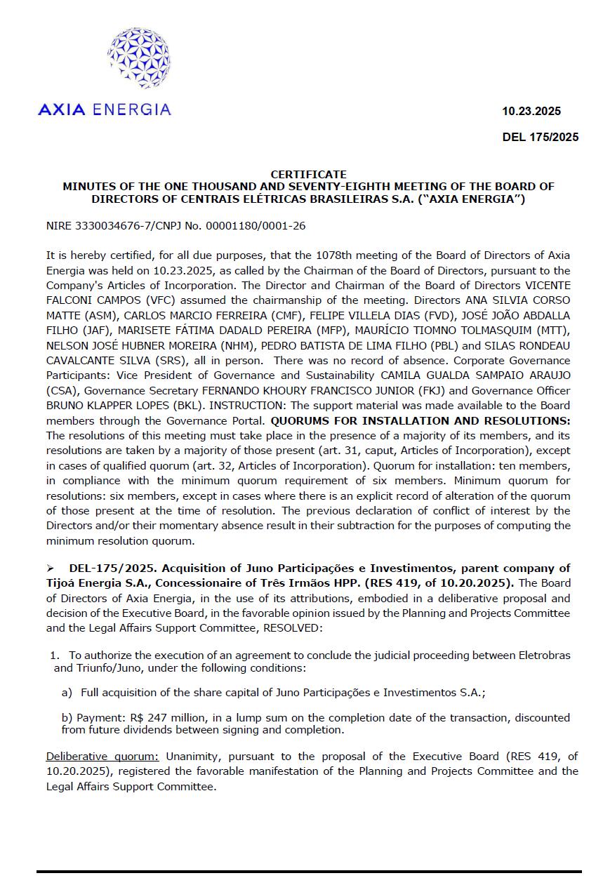 CERTIFICATE MINUTES OF THE ONE THOUSAND AND SEVENTY-EIGHTH MEETING OF THE BOARD OF DIRECTORS OF CENTRAIS ELÉTRICAS BRASILEIRAS S.A. (“AXIA ENERGIA”) NIRE 3330034676-7/CNPJ No. 00001180/0001-26 It is hereby certified, for all due purposes, that the 1078th meeting of the Board of Directors of Axia Energia was held on 10.23.2025, as called by the Chairman of the Board of Directors, pursuant to the Company's Articles of Incorporation. The Director and Chairman of the Board of Directors VICENTE FALCONI CAMPOS (VFC) assumed the chairmanship of the meeting. Directors ANA SILVIA CORSO MATTE (ASM), CARLOS MARCIO FERREIRA (CMF), FELIPE VILLELA DIAS (FVD), JOSÉ JOÃO ABDALLA FILHO (JAF), MARISETE FÁTIMA DADALD PEREIRA (MFP), MAURÍCIO TIOMNO TOLMASQUIM (MTT), NELSON JOSÉ HUBNER MOREIRA (NHM), PEDRO BATISTA DE LIMA FILHO (PBL) and SILAS RONDEAU CAVALCANTE SILVA (SRS), all in person. There was no record of absence. Corporate Governance Participants: Vice President of Governance and Sustainability CAMILA GUALDA SAMPAIO ARAUJO (CSA), Governance Secretary FERNANDO KHOURY FRANCISCO JUNIOR (FKJ) and Governance Officer BRUNO KLAPPER LOPES (BKL). INSTRUCTION: The support material was made available to the Board members through the Governance Portal. QUORUMS FOR INSTALLATION AND RESOLUTIONS: The resolutions of this meeting must take place in the presence of a majority of its members, and its resolutions are taken by a majority of those present (art. 31, caput, Articles of Incorporation), except in cases of qualified quorum (art. 32, Articles of Incorporation). Quorum for installation: ten members, in compliance with the minimum quorum requirement of six members. Minimum quorum for resolutions: six members, except in cases where there is an explicit record of alteration of the quorum of those present at the time of resolution. The previous declaration of conflict of interest by the Directors and/or their momentary absence result in their subtraction for the purposes of computing the minimum resolution quorum. ➢ DEL-175/2025. Acquisition of Juno Participações e Investimentos, parent company of Tijoá Energia S.A., Concessionaire of Três Irmãos HPP. (RES 419, of 10.20.2025). The Board of Directors of Axia Energia, in the use of its attributions, embodied in a deliberative proposal and decision of the Executive Board, in the favorable opinion issued by the Planning and Projects Committee and the Legal Affairs Support Committee, RESOLVED: 1. To authorize the execution of an agreement to conclude the judicial proceeding between Eletrobras and Triunfo/Juno, under the following conditions: a) Full acquisition of the share capital of Juno Participações e Investimentos S.A.; b) Payment: R$ 247 million, in a lump sum on the completion date of the transaction, discounted from future dividends between signing and completion. Deliberative quorum: Unanimity, pursuant to the proposal of the Executive Board (RES 419, of 10.20.2025), registered the favorable manifestation of the Planning and Projects Committee and the Legal Affairs Support Committee.