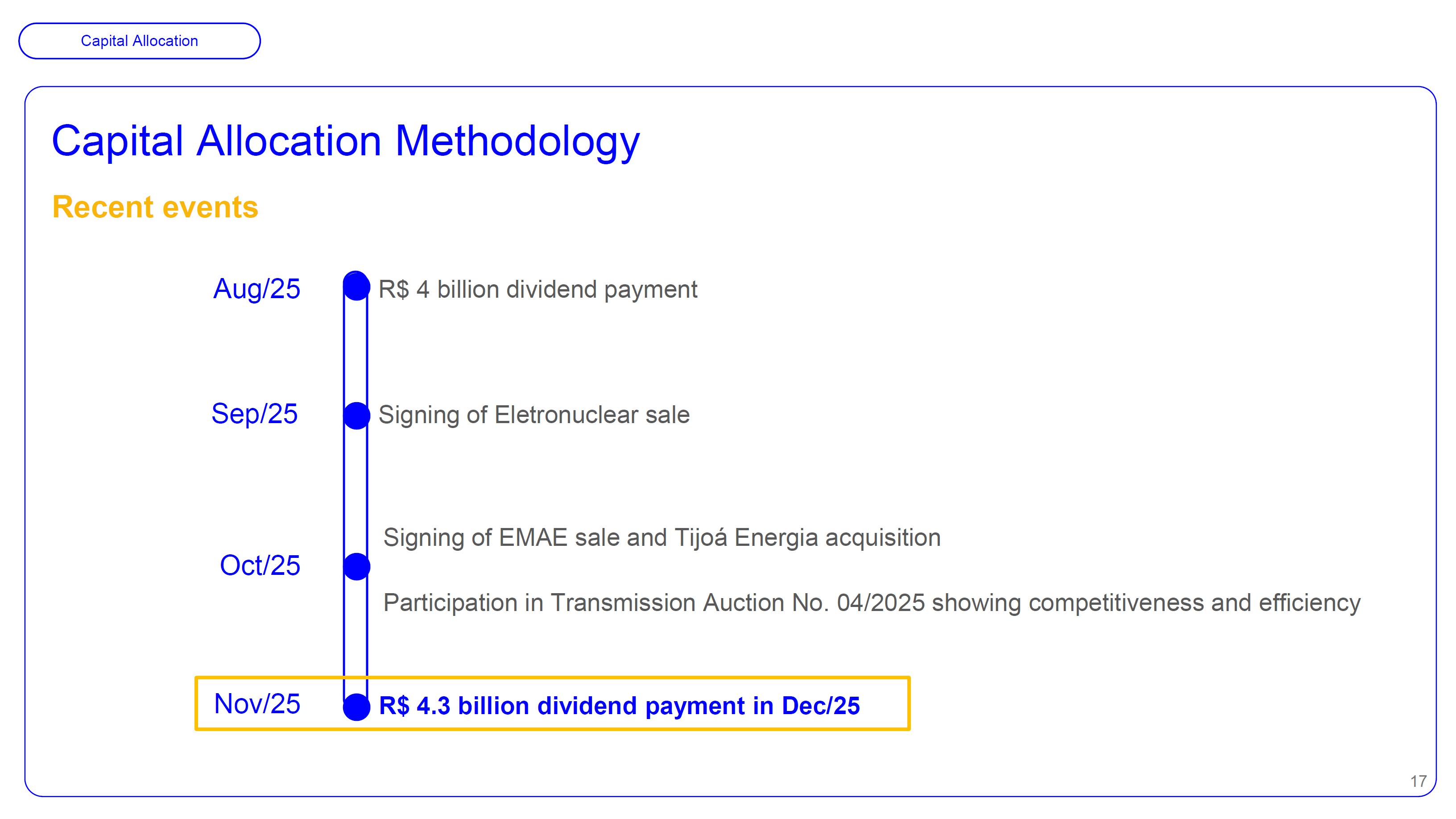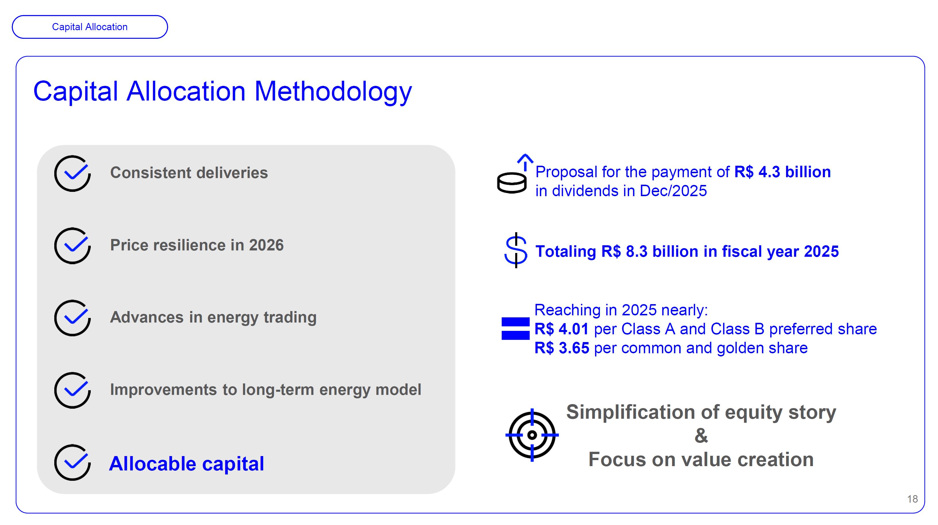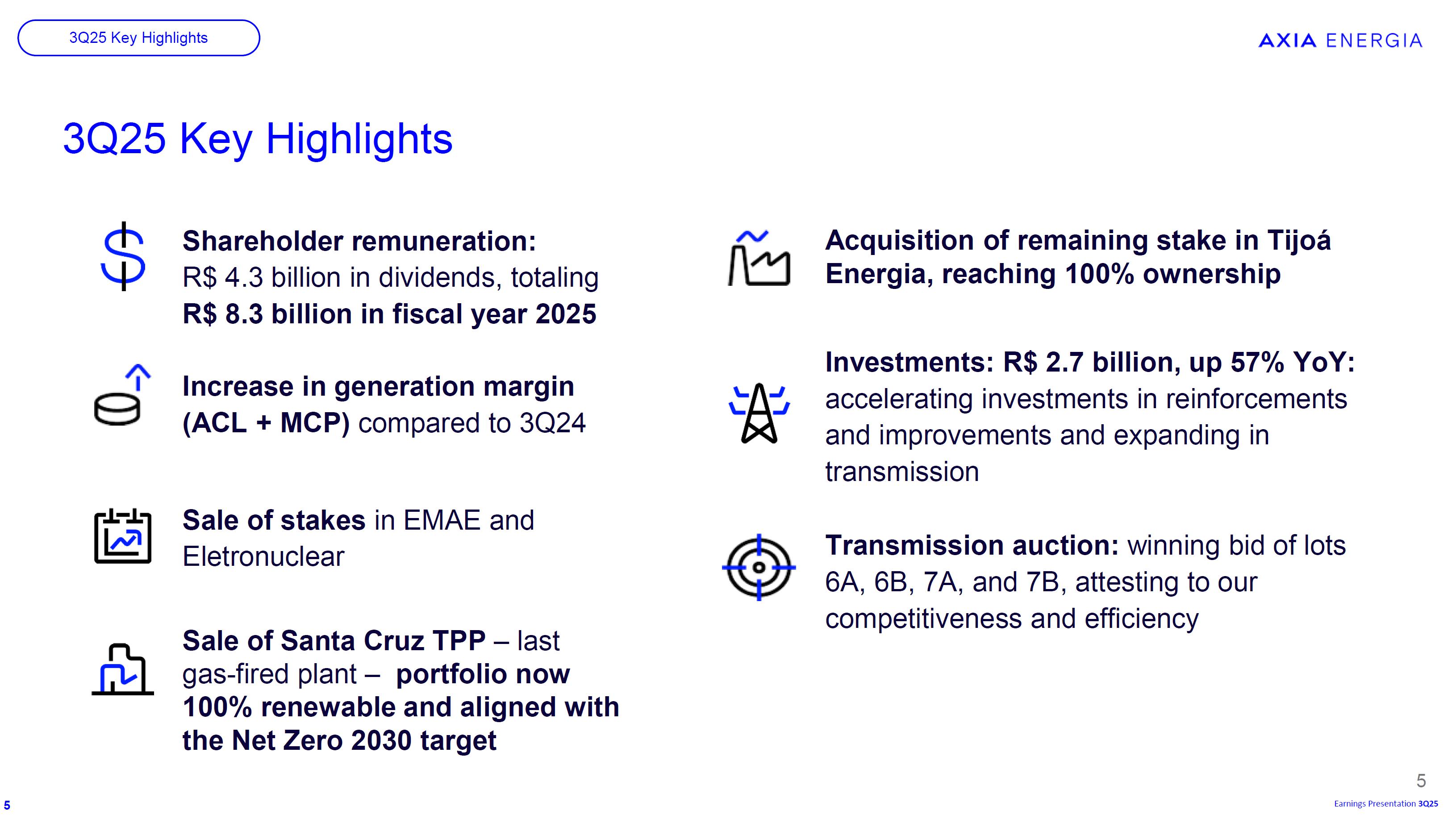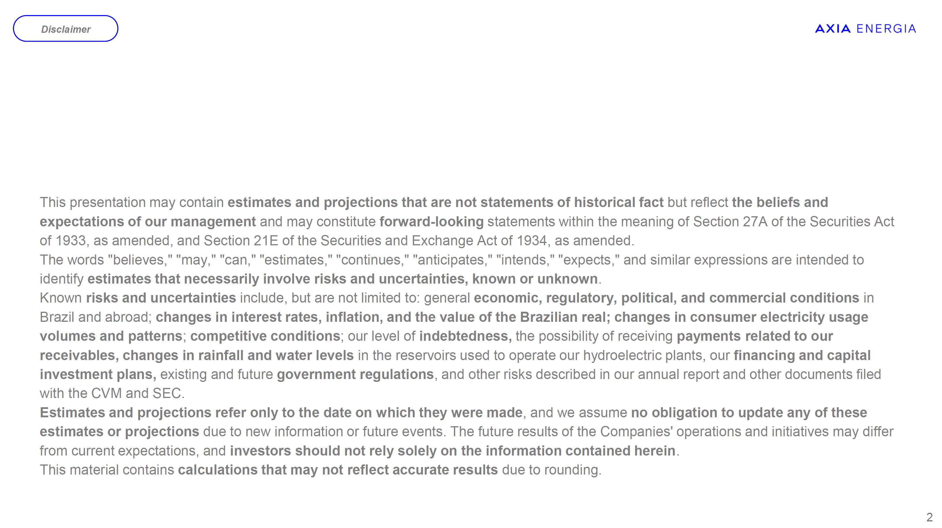 This document may contain estimates and projections that are not statements of past events but reflect our management’s beliefs and expectations and may constitute forward-looking statements under Section 27A of the Securities Act of 1933, as amended, and Section 21E of the Securities and Exchange Act of 1934, as amended. The words “believes”, “may”, “can”, “estimates”, “continues”, “anticipates”, “intends”, “expects”, and similar expressions are intended to identify estimates that necessarily involve known and unknown risks and uncertainties. Known risks and uncertainties include, but are not limited to: general economic, regulatory, political, and business conditions in Brazil and abroad; fluctuations in interest rates, inflation, and the value of the Brazilian Real; changes in consumer electricity usage patterns and volumes; competitive conditions; our level of indebtedness; the possibility of receiving payments related to our receivables; changes in rainfall and water levels in reservoirs used to operate our hydroelectric plants; our financing and capital investment plans; existing and future government regulations; and other risks described in our annual report and other documents filed with the CVM and SEC. Estimates and projections refer only to the date they were expressed, and we do not assume any obligation to update any of these estimates or projections due to new information or future events. Future results of the Company’s operations and initiatives may differ from current expectations, and investors should not rely solely on the information contained herein. This material contains calculations that may not reflect precise results due to rounding.
